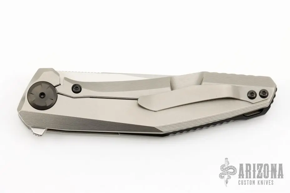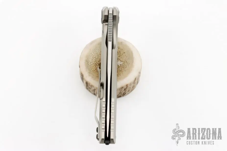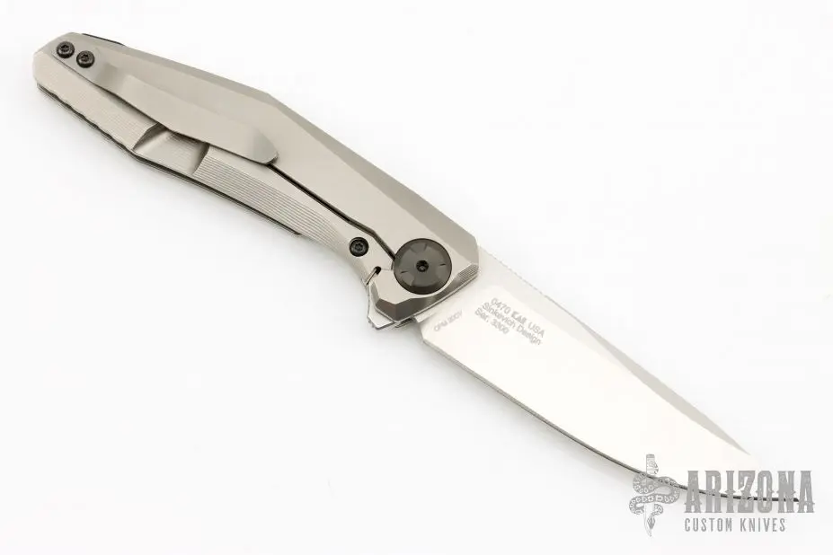 This 0470 Sinkevich designed folder from Zero Tolerance features a drop point blade with swedge. The frame is comprised of tumble finished titanium, a marbled carbon fiber inlay and anodized aluminum back spacers. Titanium pocket clip can be adjusted for left or right hand carry. Excellent condition. #3300. Comes with oiriginal box and papers.
