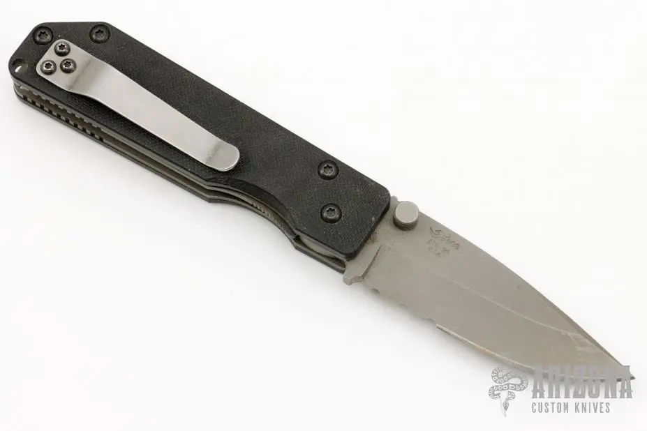 Tactical folder made by Buck with Strider engineering. Bead blasted partially serrated blade and textured black G10 scales with titanium liners and a tip up carry clip SS clip, left or right hand reversible. Good lockup, detent and seating. Has some scuffs, otherwise good condition.