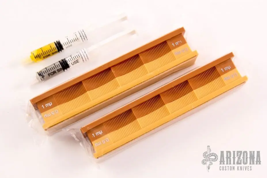 Leather Strops with 7ml bottles of 1 Micron and 0.5 Micron Polycrystalline Diamond Emulsion. The emulsions that come with these strops are more aggressive and last longer than our standard diamond paste, thus making them an extremely effective stropping compound.