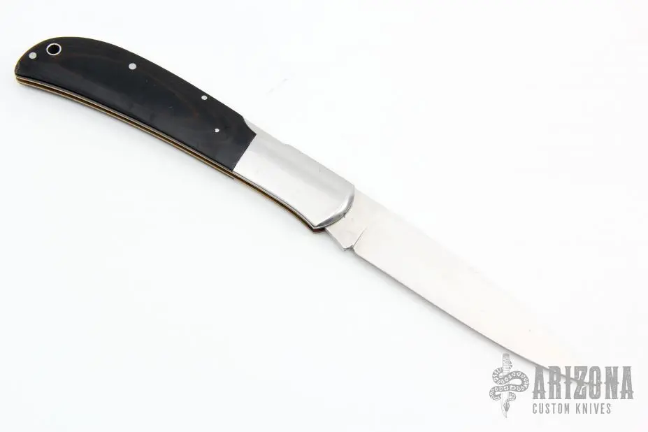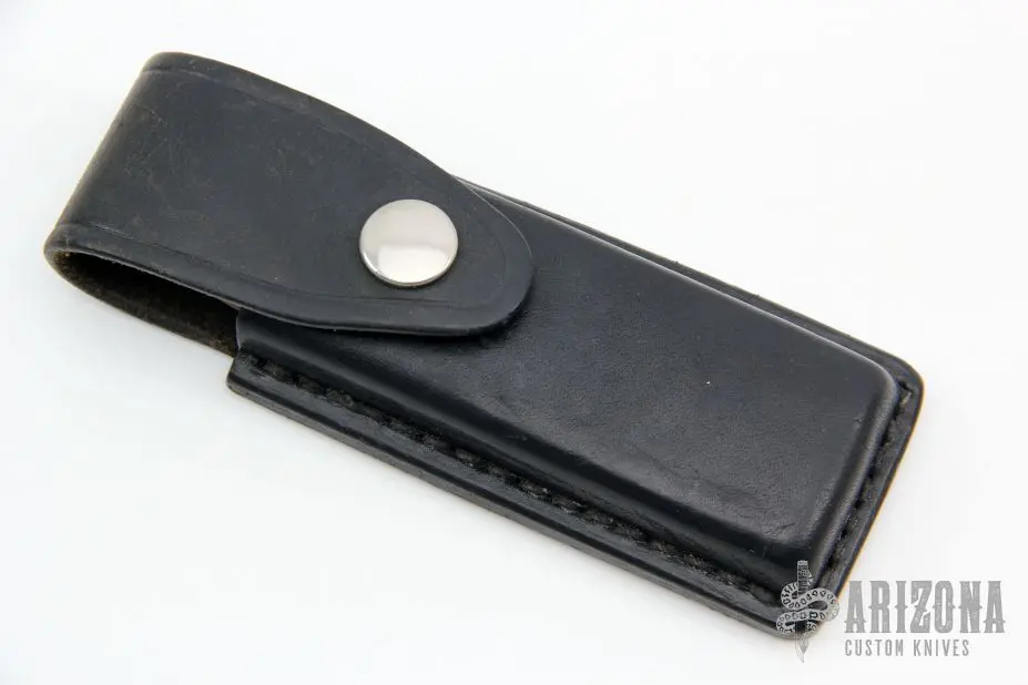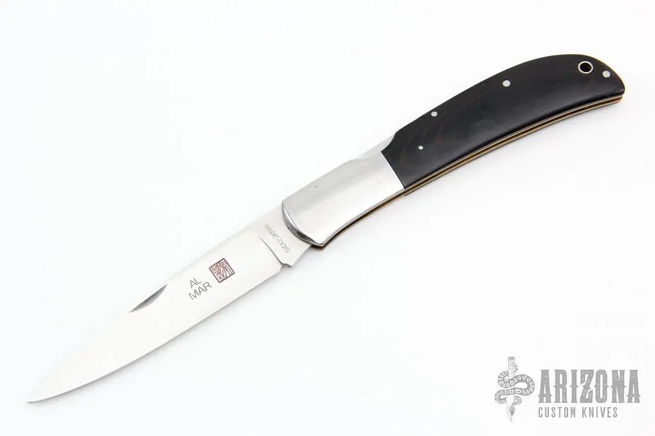 This Eagle by Al Mar features a satin finished blade with nail nick. The handle has stainless steel bolsters, black/brown paper micarta scales, brass liners, stainless steel backspacer. Comes with original black leather sheath. Has scratches, has been resharpened, otherwise good user condition.