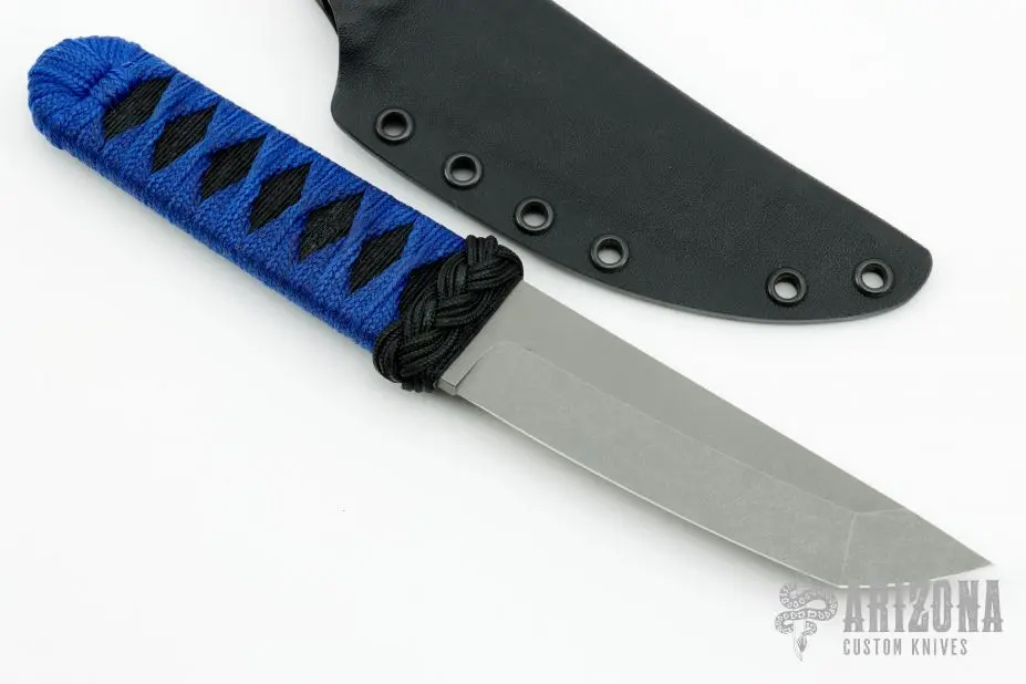 This 5″ Oregonto from Ben Tendick of B.R.T. Bladeworks features a tumbled tanto style blade with swedge. .187″ Blade Stock. 1.271″ Blade Depth. The handle features a black and blue wrap over a black hemp cord under wrap. Includes a kydex sheath. Brand New from Maker.