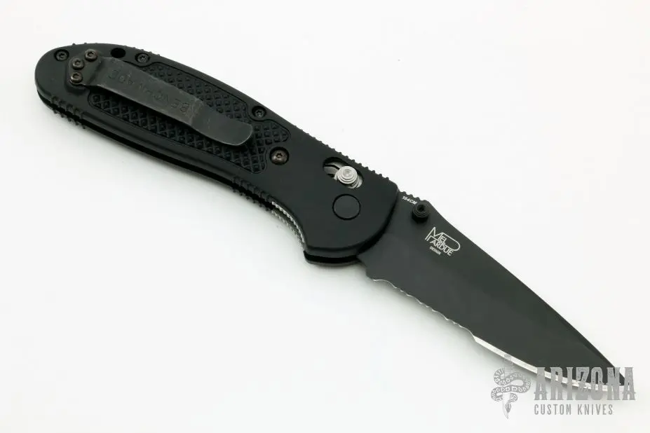 This axis-lock was designed by Mel Pardue and made by Benchmade features a black blade with partial serrations, a notched thumbrest and dual thumb studs. Â The handle is composed of black FRN and a black steel tip up pocket clip. Â Excellent Condition. Â