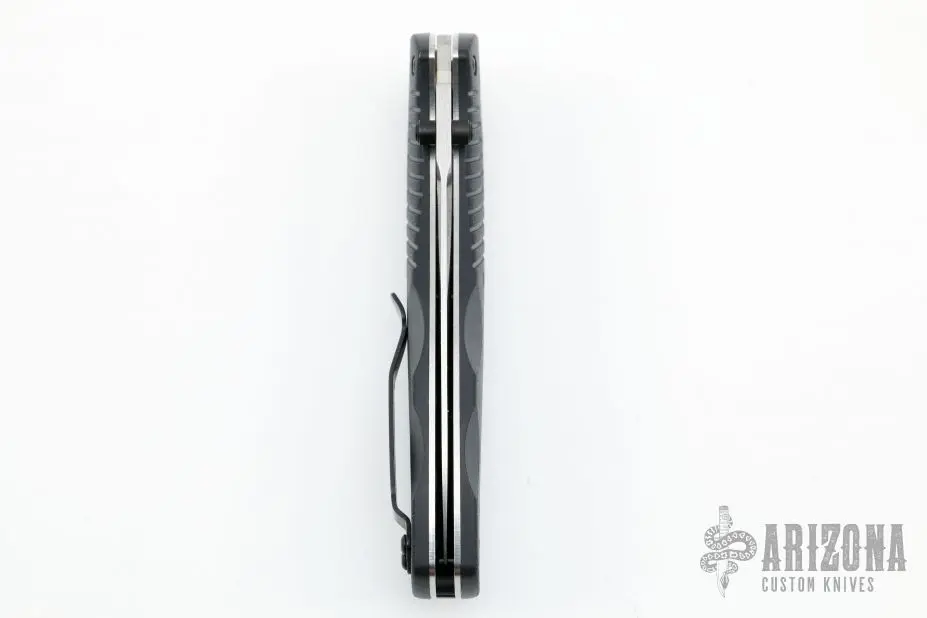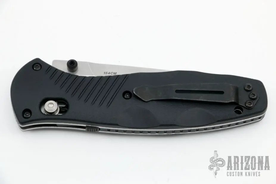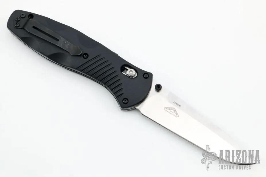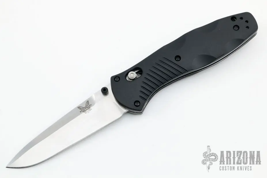 This 580 Barrage from Benchmade features a satin finished drop point blade with swedge and dual thumbstuds. The handle is comprised black FRN scales over stainless steel liners and FRN backspacer. This knife also features the AXIS lock mechanism and sliding safety on spine. Includes a black nylon sheath. Excellent condition.