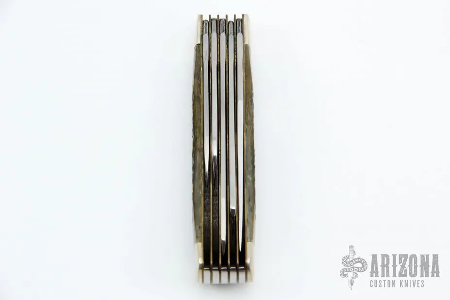 This slipjoint by Case has mirror polished blades with nail nicks. The handle has nickel silver bolsters, jigged bone covers, brass liners and steel springs. Has some light scratches, otherwise excellent condition. Comes with original box and papers. 4DOT.Â