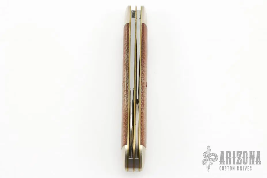 Handle: Canvas Micarta scales offer a warm in hand feel and solid traction, flush fit between two brushed nickel silver bolsters. The pattern is eye catching with a bullet end mimicking the shape of the spear point blade. Brass liners and pins round out construction along with the Bottle shield.