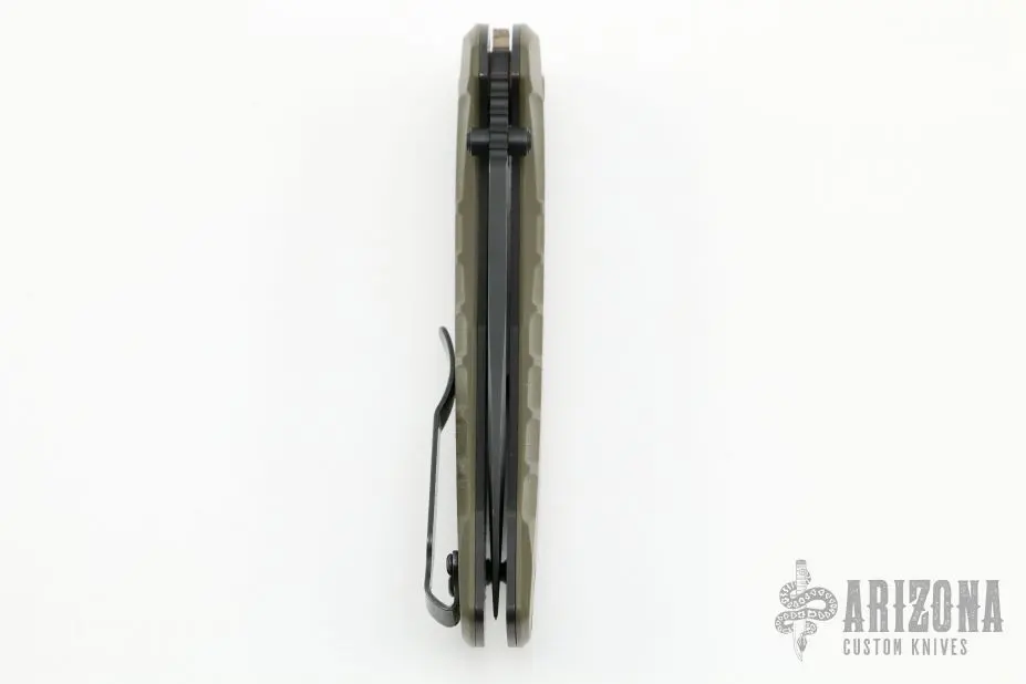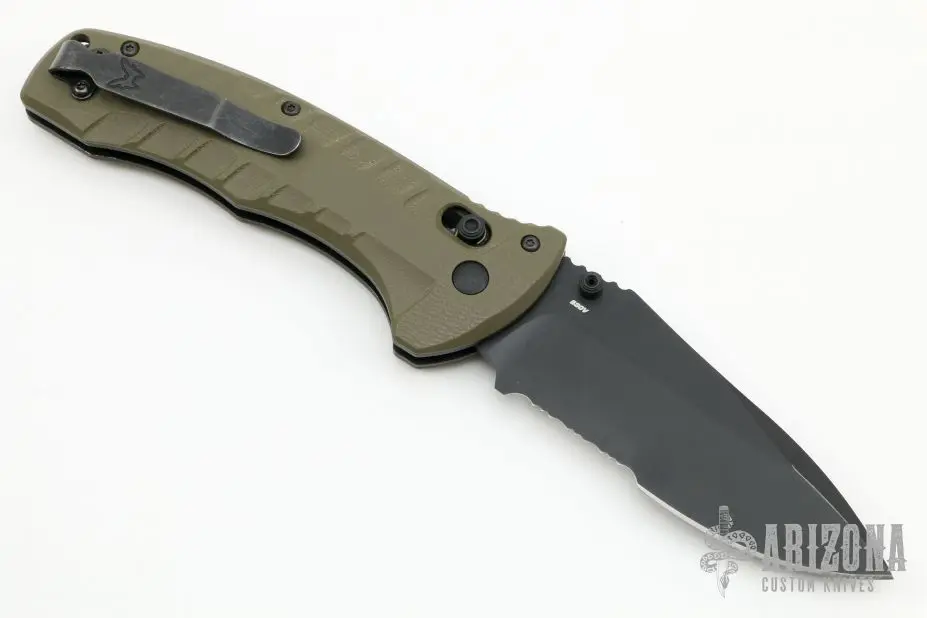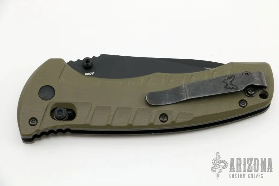 This model of the Benchmade Turret sports a black partially serrated blade made from CPM-S30V, and OD green G-10 handle scales.Â