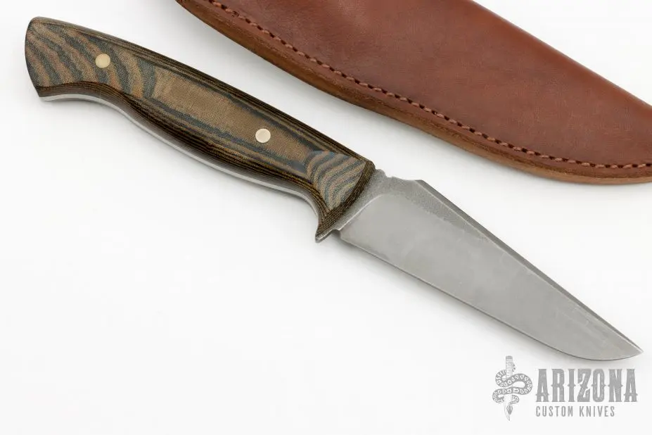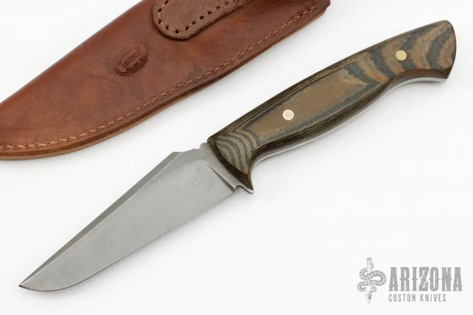 This Beagle V2.0 by Doberman Forge features a tumble finished clip point blade with notched thumbrest and false top edge, .132″ blade stock and 1.165″ blade depth, full tang construction. The handle has black/green linen micarta scales. Comes with a brown leather sheath. New from maker.