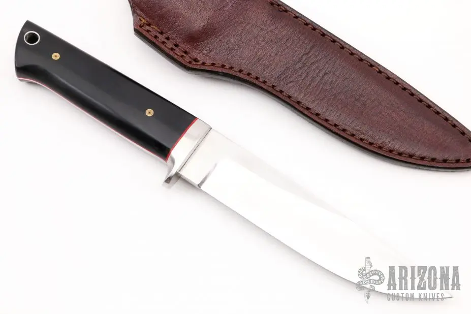 This Hunter from Ricardo Perpina features a satin finish blade with .192″ blade stock and 1.208″ blade depth, full tapered tang construction. The handle has a stainless steel guard with black paper micarta scales and red liners. Coems with a brown leather sheath. New from maker.