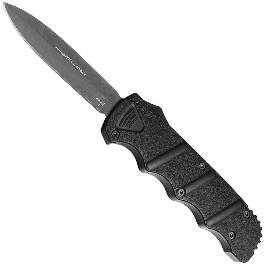 The Boker Plus Black Kalashnikov double-action Out the Front boasts a tough, contoured design. Featuring the classic styling of the Kalashnikov knives, this OTF auto boasts a 3.5″ dagger blade with black stonewash finish and a black anodized aluminum handle. The side slide trigger is smooth and action is fast. The blade locks up tight. The Kalashnikov OTF is a great everyday carry.