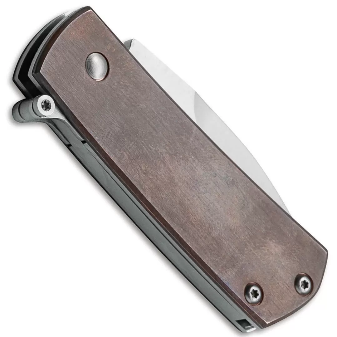 The Boker Plus Shamsher , designed by Darriel Caston and Stan Mojzis, boasts a minimalistic design. This slim knife features a blade made of D2 tool steel which is opened by spring force when the trigger is pressed. The blade is locked securely by a linerlock. The blade is paired with a stunning copper handle which is designed to sit comfortably in your hand. The copper forms a unique patina over time, making this knife unique to you. The Boker Plus Shamsher is an excellent everyday carry.Â
