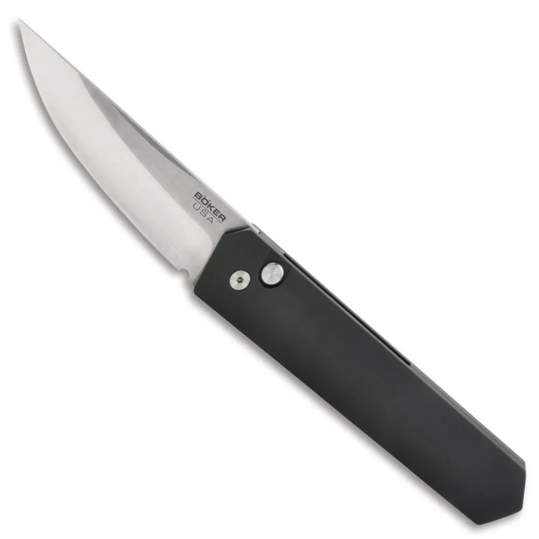 The Kwaiken auto quickly became Boker’s top-selling automatic model and 2019 debuts the smaller Mini Kwaiken auto model. The Kwaiken folder, designed by Lucas Burnley, has been one of the most popular products that has stemmed an entire array of various models. As if it couldn’t get any better, Boker Plus is excited to announce the newest addition–the Kwaiken automatic. Built by the automatic knife manufacturing power-player Pro-Tech Knives, these knives blend the classic slimline profile with impressive push-button power. This smaller model features a black anodized aircraft-grade aluminum handle, custom abolone inlay within the push-bottin, a drop point style blade in a stonewash finish and the pocket clip is statically designed for tip up carry only on the traditional side of the handle. Made in the USA.