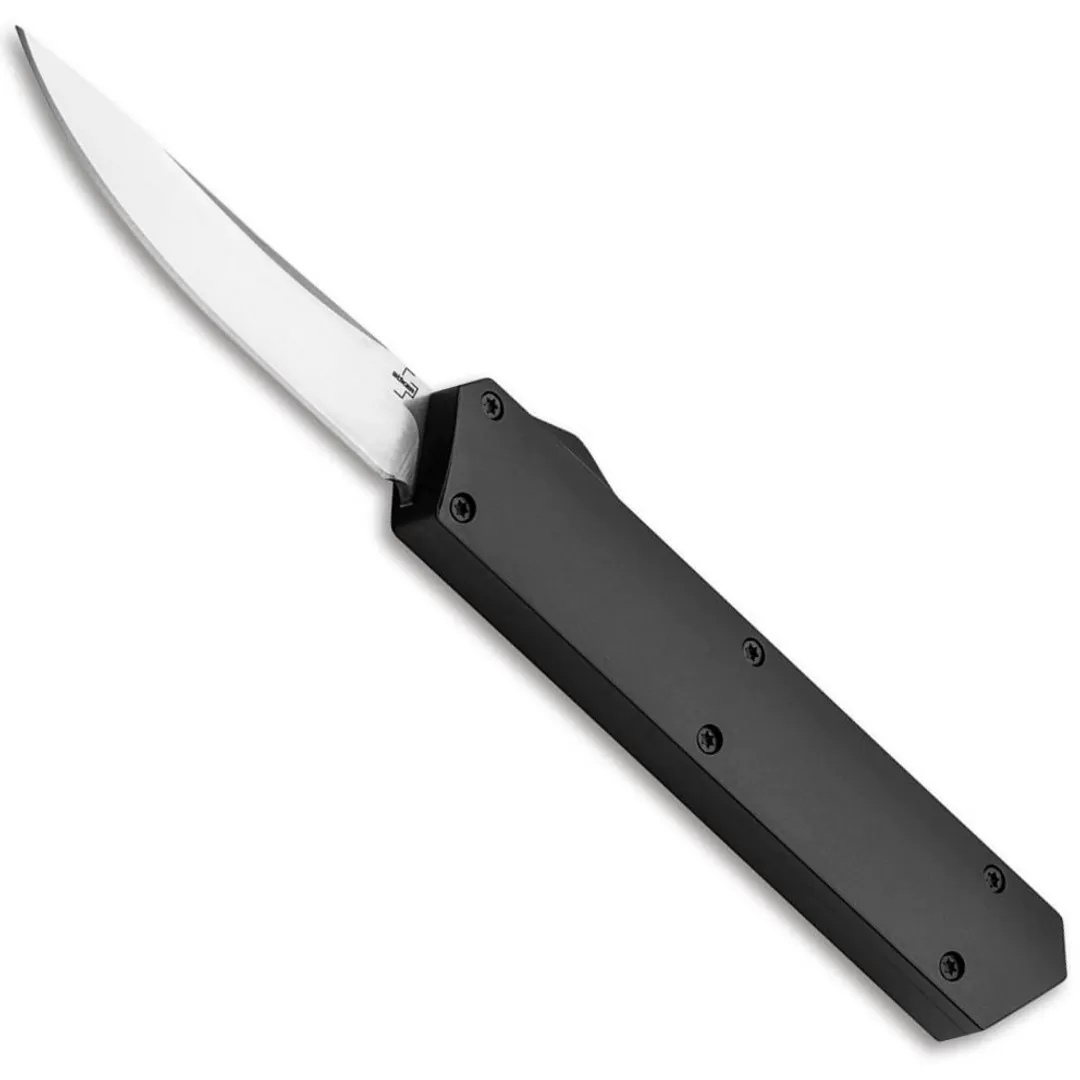 The Boker Plus Kwaiken OTF double-action automatic is here. This Lucas Burnely design features a black anodized handle and a satin finished D2 blade.