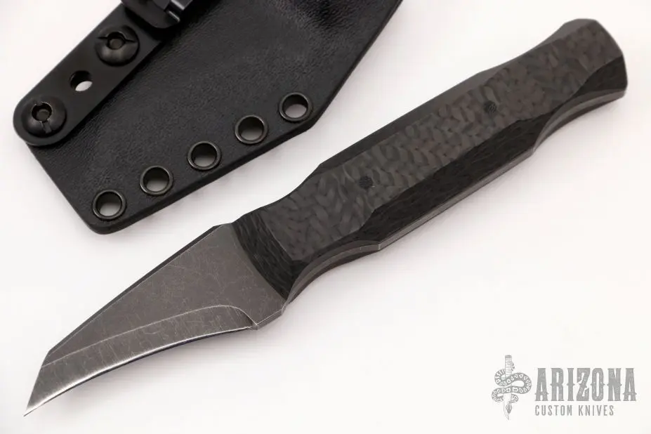 This Pocket Rocket V3 by Auxiliary Manufacturing features an acid tumbled blade with .135″ blade stock and 1.080″ blade depth. The handle has carbon fiber scales with black linen micarta pins. Comes with a kydex sheath with clip. New from maker at the 2022 Blade Show West.