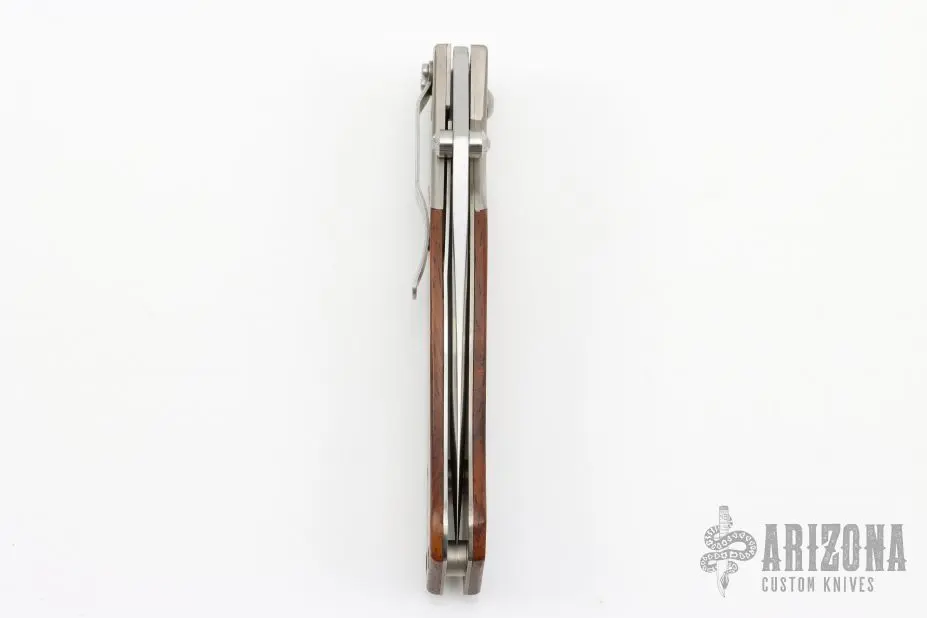 This is a Boker/Brend collaboration is Discontinued. The blade is satin finished with dual knurled thumbstuds. The handle has titanium bolsters, wood scales, stainless liners and tip down stainless clip. Nice detent, lockup and seating. Excellent condition.