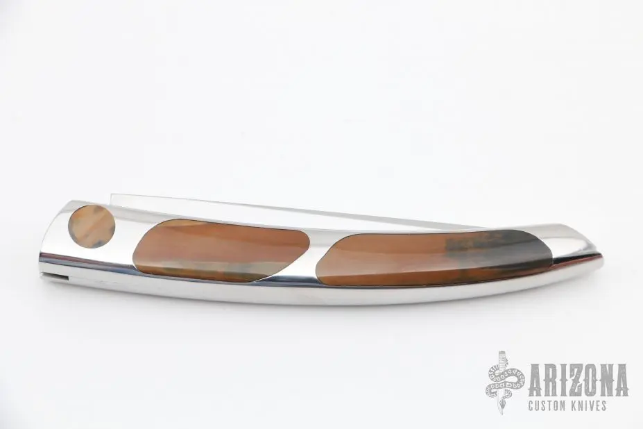 This Button Lock Folder by Charles Bennica features a mirror polished blade with nail nick. The handle has a mirror polished stainless steel frame with mammoth ivory inlays and mammoth ivory button. Comes with a zippered case. Marked “01” on the handle. Excellent condition.