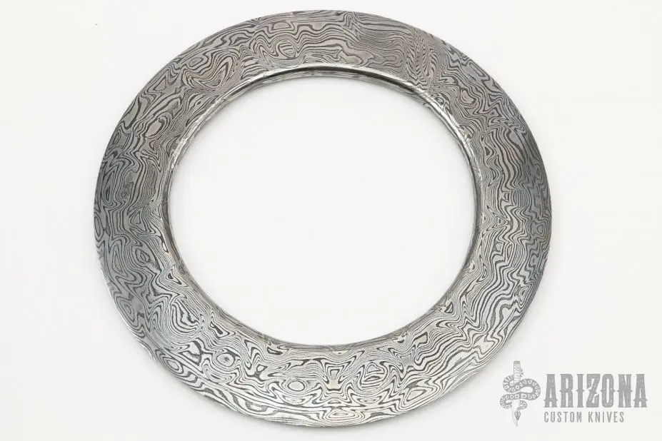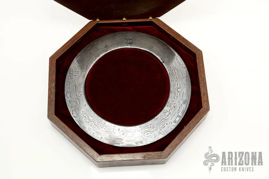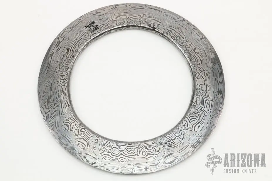 This Chakram by Stuart Smith features his 10yr Collectors logo. It is made of W’s Pattern Damascus made from 15n20 and 1070 steels. It measures 6.5″ in diameter and has a 4.25″ diameter opening in the center. .260″ thick. Comes with a COA dated 6-9-18 and a Partridge wood display case. Excellent condition!