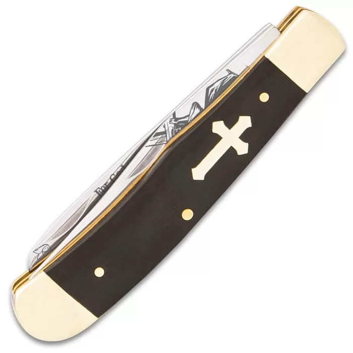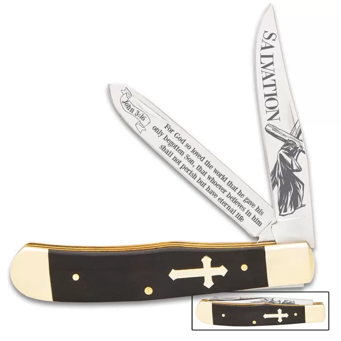 Our Salvation Trapper Pocket Knife is an elegant knife with a spiritual theme, making it perfect as a gift for any occasion for family, friends or church members. The pocket knife has keenly sharp stainless steel blades with a mirror-polished finish with spiritual themed etchings including the Bible verse, John 3:16. It has a nickel silver classic style cross inlaid into the black buffalo horn handle and the scales are secured by stainless steel pins. The trapper is 4”, when closed, and it has a nickel silver bolster on each end, elegantly complementing the sleek handle.
