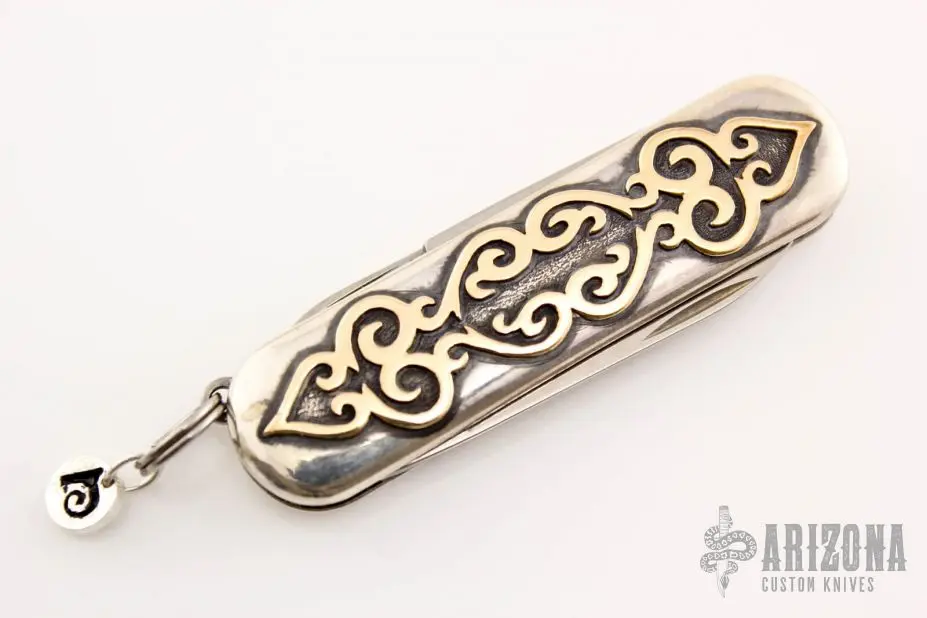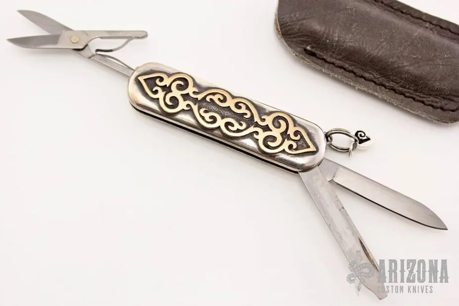 This Victorinox Classic features a spearpoint blade, nail file and scissors. The handle is comprised of sterling silver covers with gold overlays over stainless steel springs. Lanyard bail with split ring on pommel. Good condition. Includes leather slip sheath.