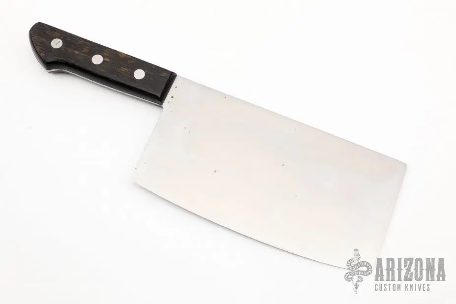 This cleaver by Al Mar features a satin finish blade with .0875″ blade stock and 3.5″ blade depth, full tang construction with wood scales. Has some patina and light pitting, shows some oxidation and dings in the blade edge. Otherwise great condition.Â