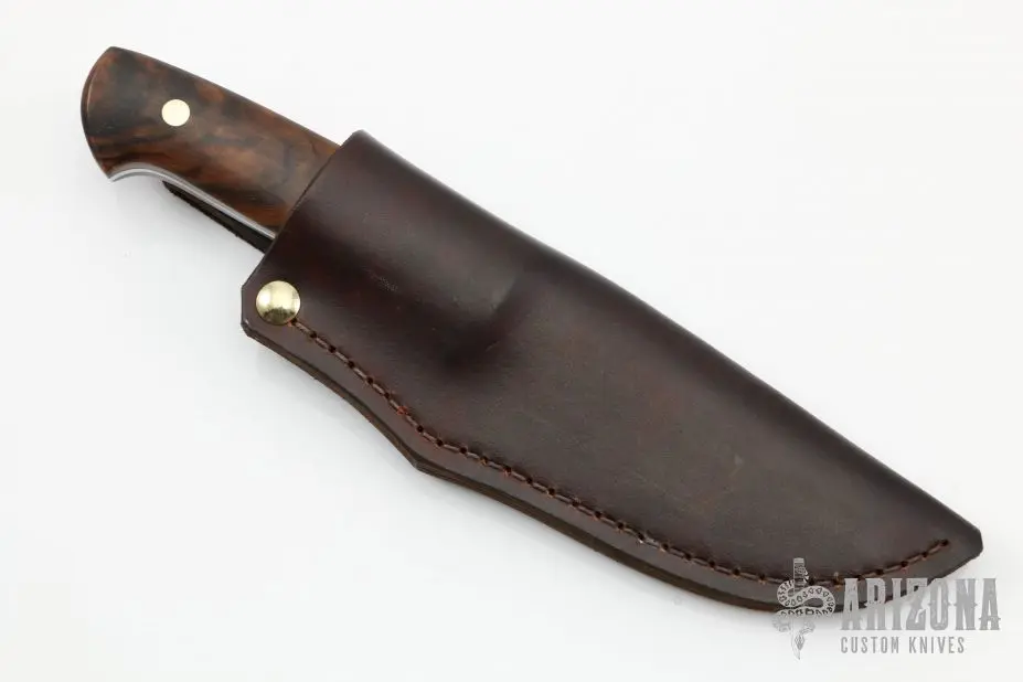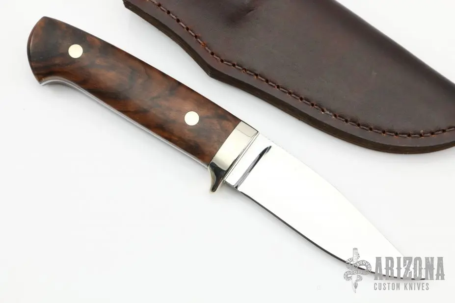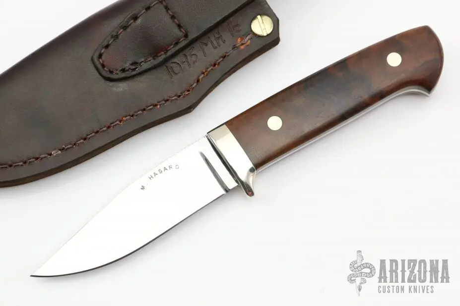 This Hunter by Mark Hasard features a mirror finished blade with false top edge, .181″ blade stock and 1.048″ blade depth, full tapered tang construction. The handle has a nickel silver guard, walnut scales and nickel silver pins. Comes with a brown leather sheath. Excellent condition.