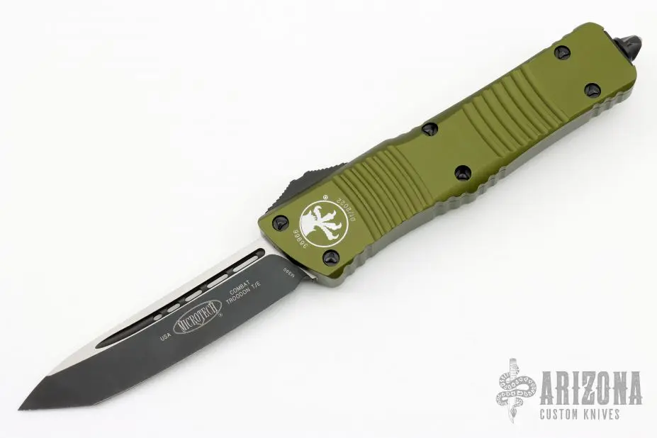 This Combat Troodon OTF automatic by Microtech knives features a black tanto blade, and a green aluminum handle with black hardware, tip down carry. Glass breaker. S/N 36966. Dated 01/2022. Light scratches are visible on the frame otherwise the knife is in Excellent condition.