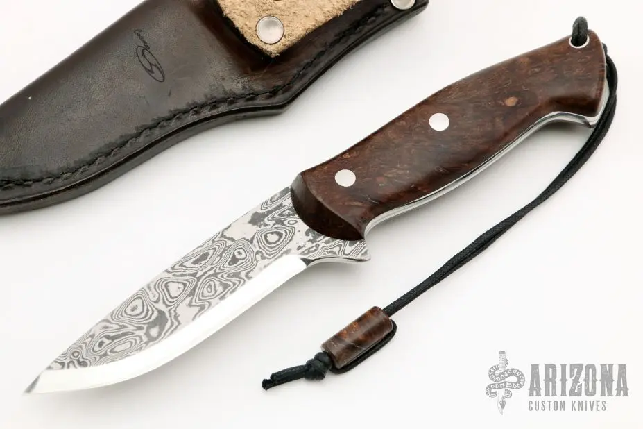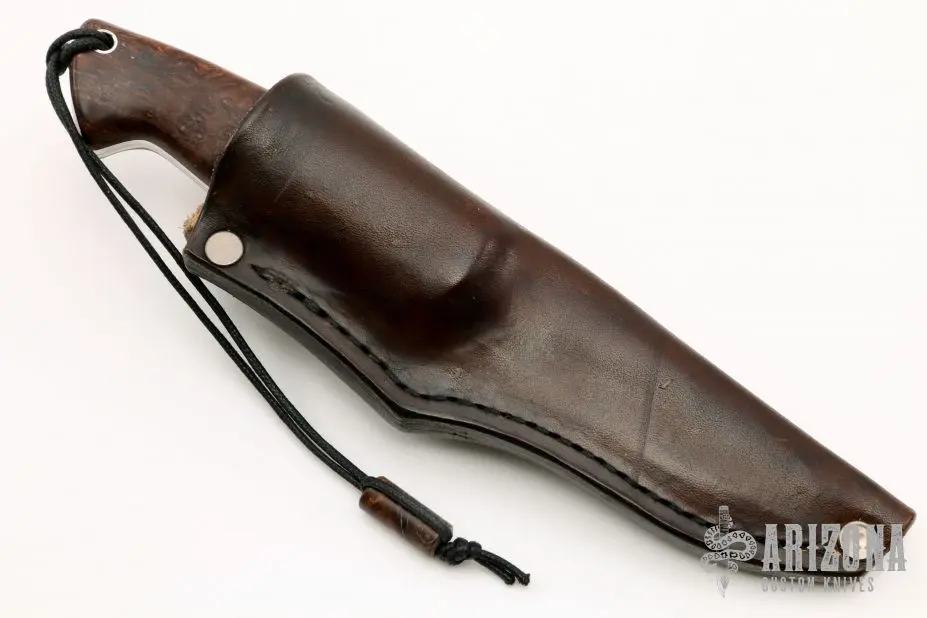 This Compact Bushcrafter by Cosmo Knives features a scandi ground S90V core San Mai Damascus blade with .139″ blade stock and 1.069″ blade depth, full tang construction. The handle has dark maple burl wood scales with a lanyard hole. Comes with a brown leather sheath. #2567 on the blade. Excellent condition.