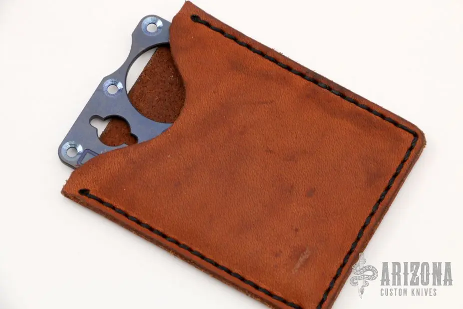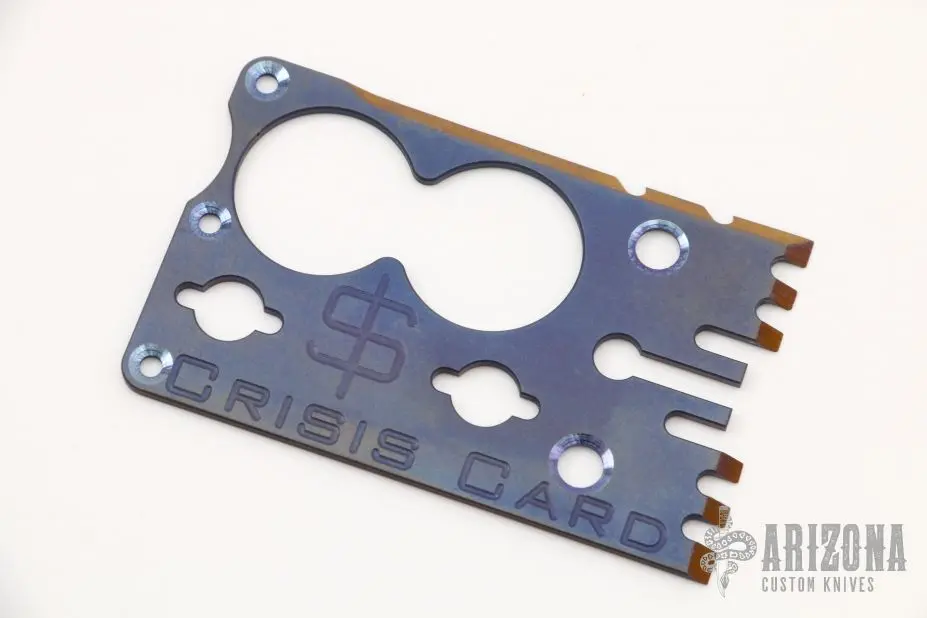 This titanium Crisis Card by Mike Snody has a chisel ground blade and milled frame. Comes with COA dated 2009 and brown leather sheath. Excellent condition.Â