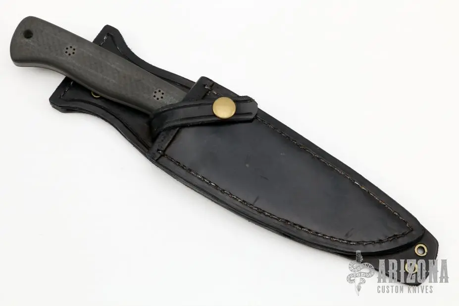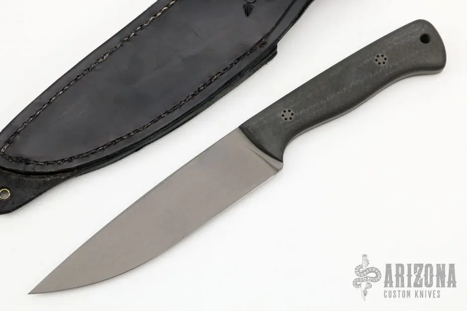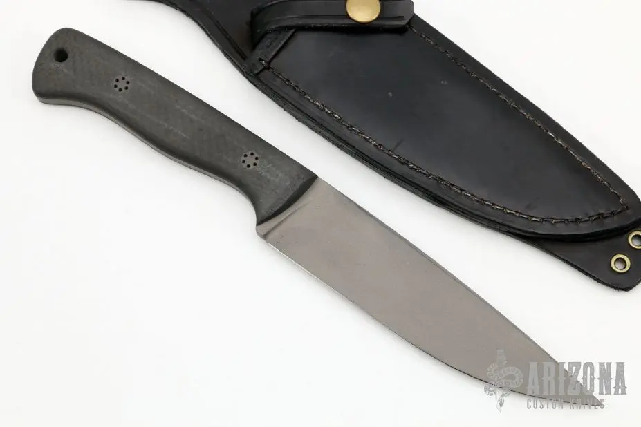 This fixed blade from Todd Rexford features a bead blasted blade with .176″ blade stock and 1.418″ blade depth, full tang construction. The handle has carbon fiber scales with custom hardware. Comes with a black leather sheath with belt loop. Excellent condition.
