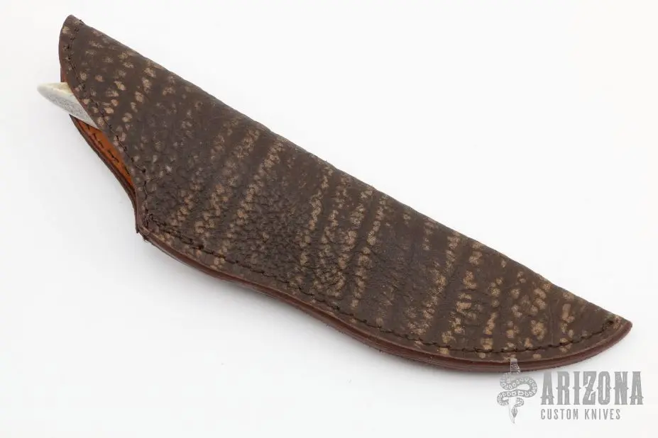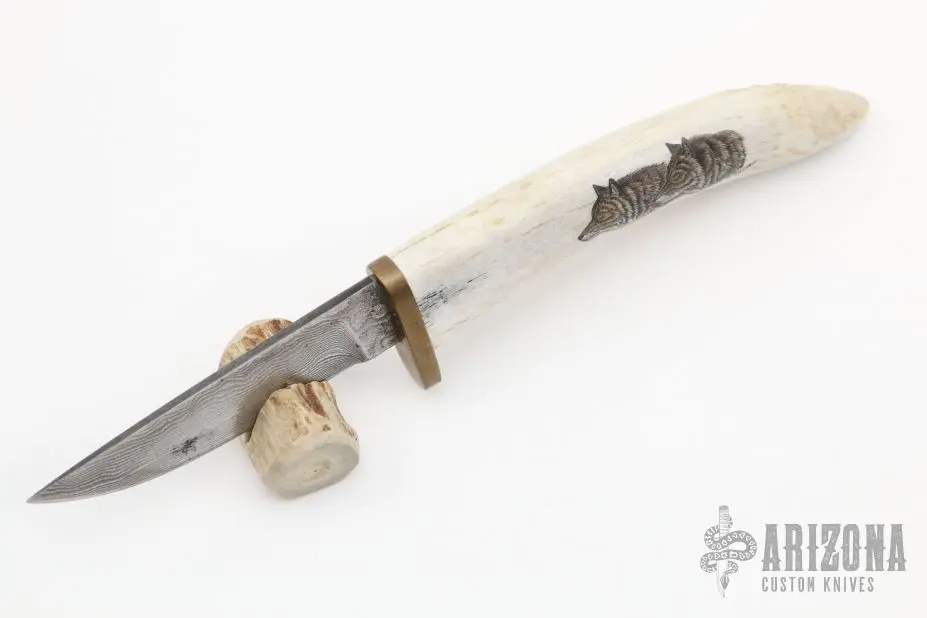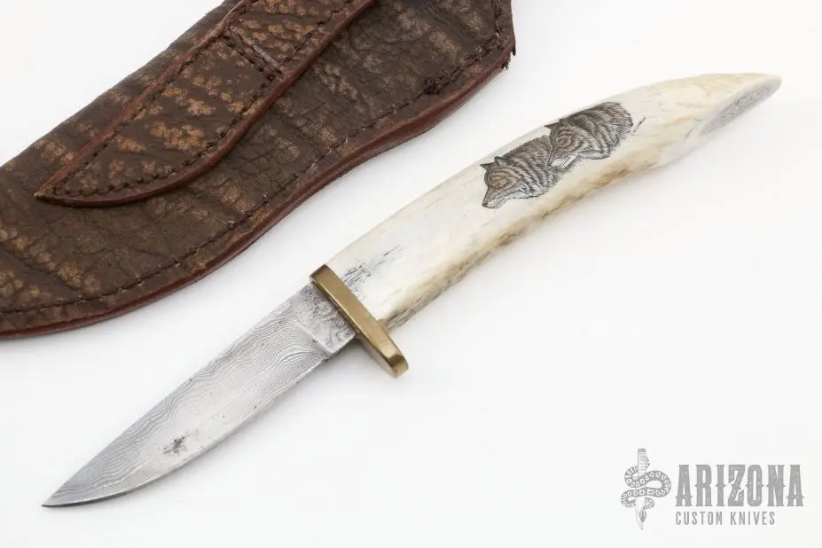 This knife by Silver Stag features a Damascus blade with .097″ blade stock and .675″ blade depth, hidden tang construction. The handle has a brass guard and stag grip that has been scrimshawed by C.W. Conner. Comes with a brown leather sheath, but it is not original to the knife and is a little big. Has some spots on the blade, otherwise good condition.