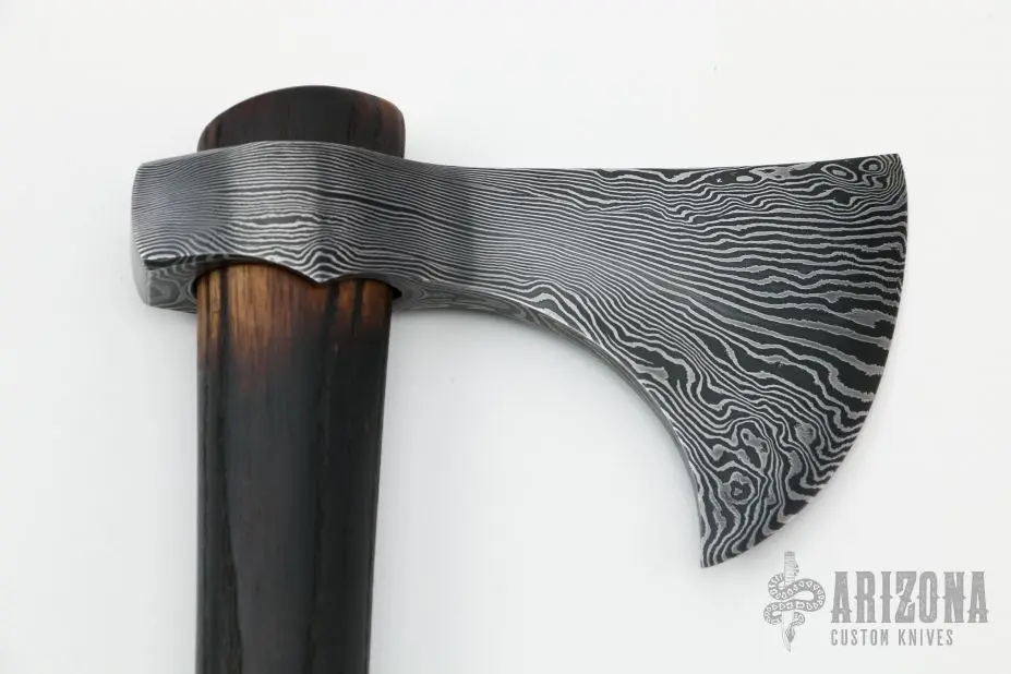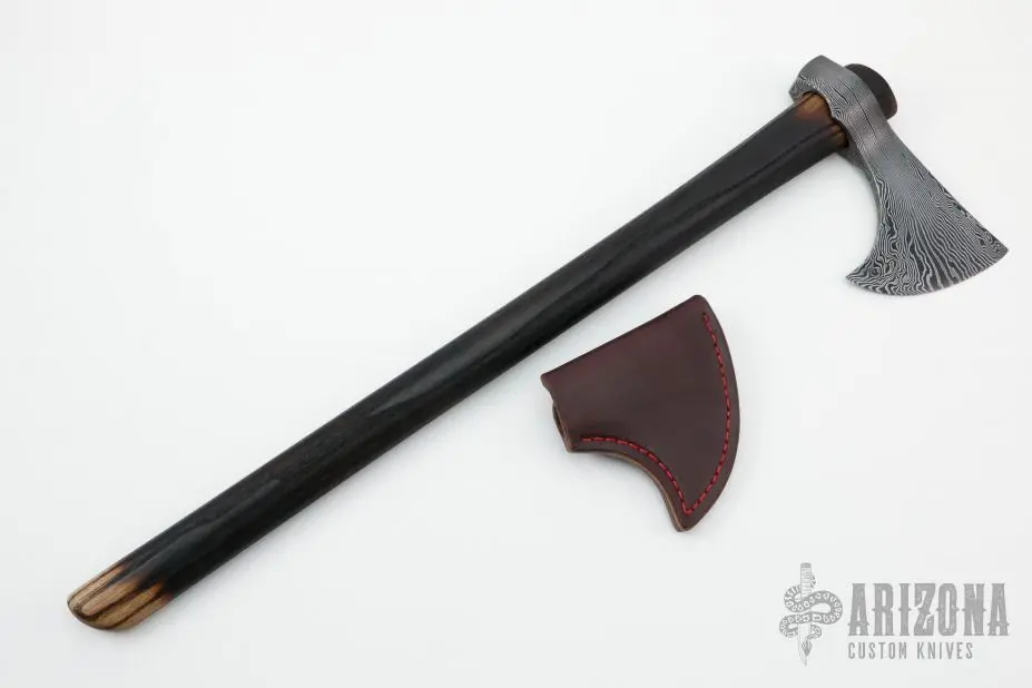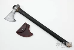 This tomahawk by Andrew K Smith features a Damascus head. Â Has a 20″ burnt hickory shaft. Comes with leather blade cover with snap. Â New From Maker!Â