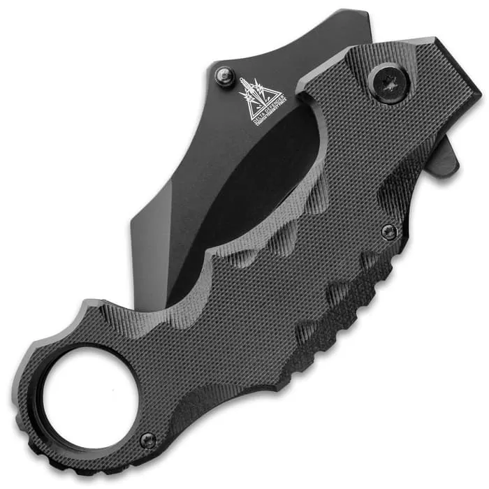 Designed and constructed for the modern battlefield, the Delta Defender Assisted Opening Black Karambit Knife takes a traditional design pumps it up with steroids and folds it so that it will still fit in a pocket. The knife has a 3” razor-sharp karambit blade with a black, non-reflective finish and double thumbstuds for quick deployment, activating the assisted opening mechanism. The textured black G10 handle scales are thick and beefy and have an ergonomic grip for a secure, no-slip hold when using the knife. The folding karambit is 5 1/4” when closed and has the traditional thumb ring and a sturdy pocket clip for ease of carry.