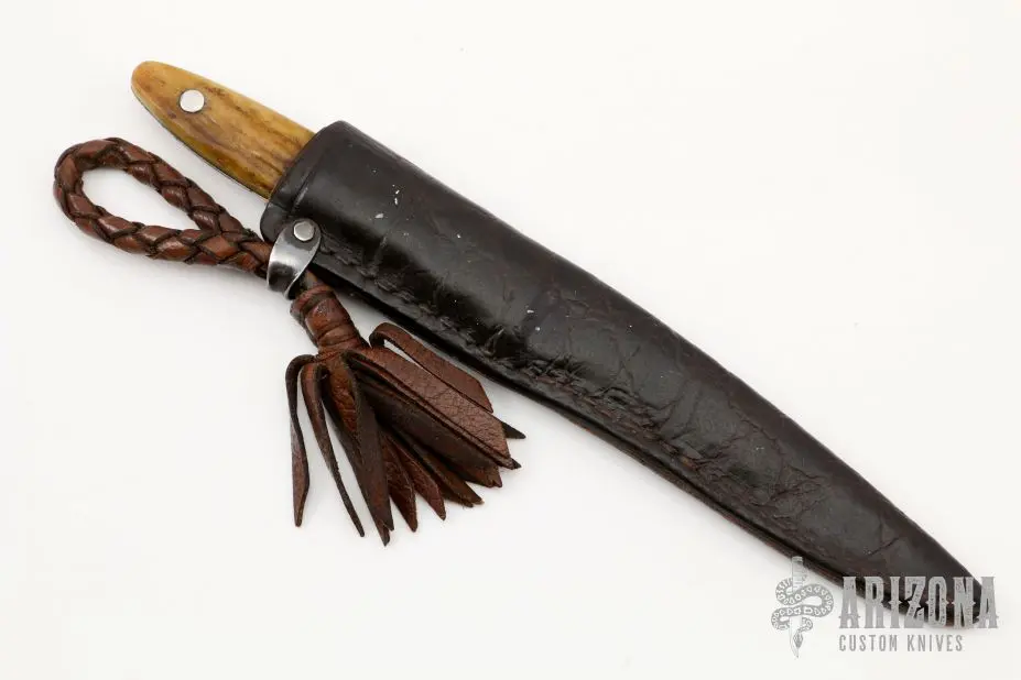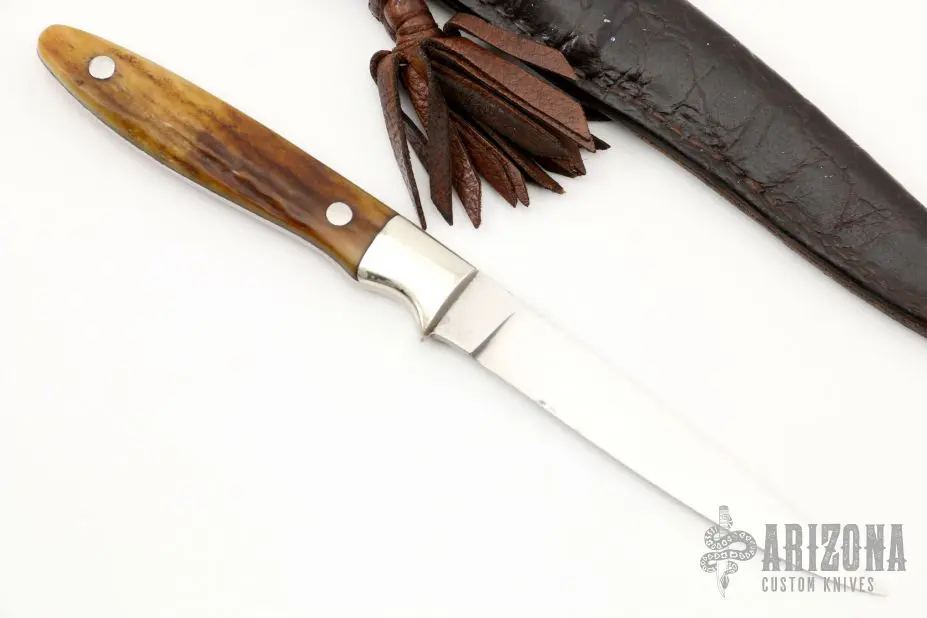 This Fighter by Master Smith PJ Tomes features hand rub satin finish, .127″ blade stock and .612″ blade depth, tapered tang construction. The handle has dovetailed nickle silver bolsters, and stag scales. Comes with leather sheath. Has some light scuffs and scratches, great condition otherwise.Â