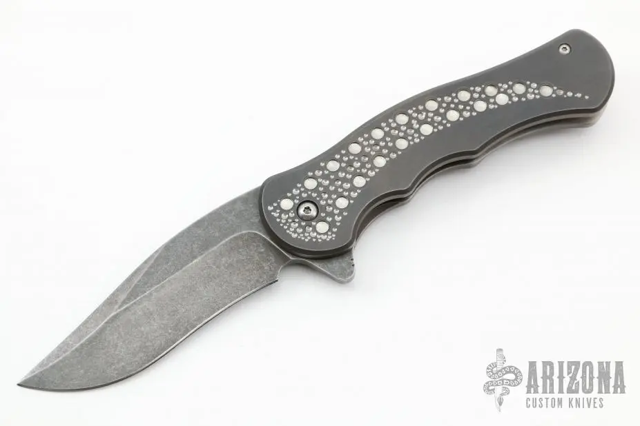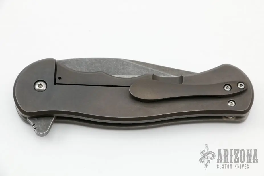 This Dorado flipper by Matt Cucchiara features a dark finished clip point blade with a notched flipper. The handle has a milled titanium frame with matching tip up clip. Nice detent, lockup and blade seating. Cucchiara is engraved on the inside of the frame. Excellent Condition.Â