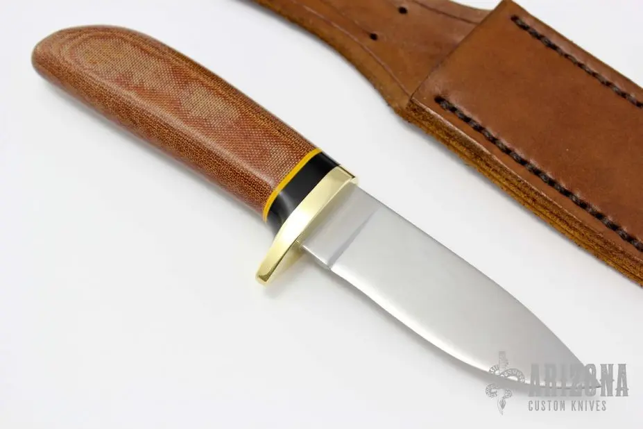 This fixed blade from J. Vigil features a satin finish drop point blade. The handle is comprised of a brass single guard and yellow and black fiber spacers with natural micarta handle over hidden tang construction. Includes leather sheath with belt loop. New from maker. Blade Steel: AEB-L Stainless