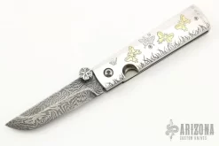 This Folder by Scott Slobodian features a Paul Strand “Explosion” Damascus steel blade with and single engraved silver thumbstud. The handle has pure silver scales with engraving and gold inlays, titanium liners, bead blasted stainless steel backspacer. Knife opens and closes smoothly and locks open with no blade play. Nice blade seating. Has some light scratches, otherwise excellent condition. Comes with a silver pendant with similar engraving and gold inlay, hung on a rubber necklace.