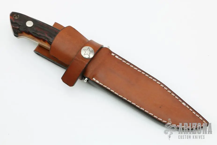 This Fighter by the Late Masao Takahashi features a mirror polished San Mai blade with ZDP-189 core, sharpened top edge, mirror polished nickel silver fittings, and stag scales with nickel silver pins. .179″ blade thickness and .946″ blade depth, full tapered tang construction. Comes with brown leather sheath. Excellent condition.