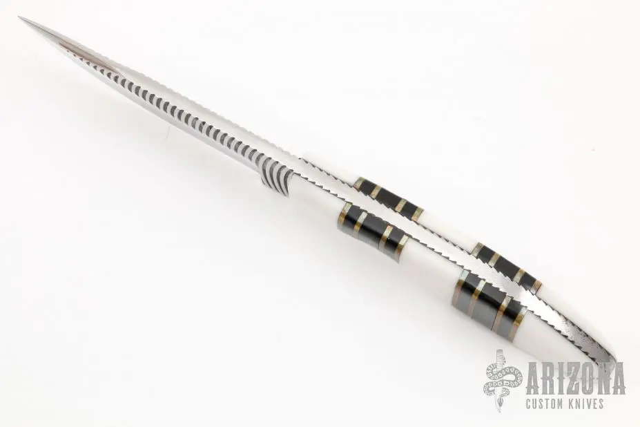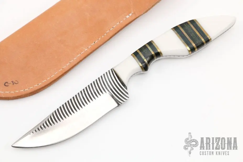 This Hunter by Anza Knives features a blade made from an old rasp, white corian/brass/wood scales, .178″ blade thickness and 1.131″ blade depth, full tang construction. Comes with a brown leather sheath. Excellent condition.