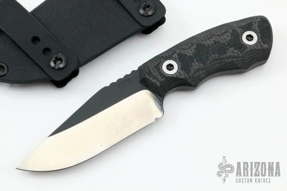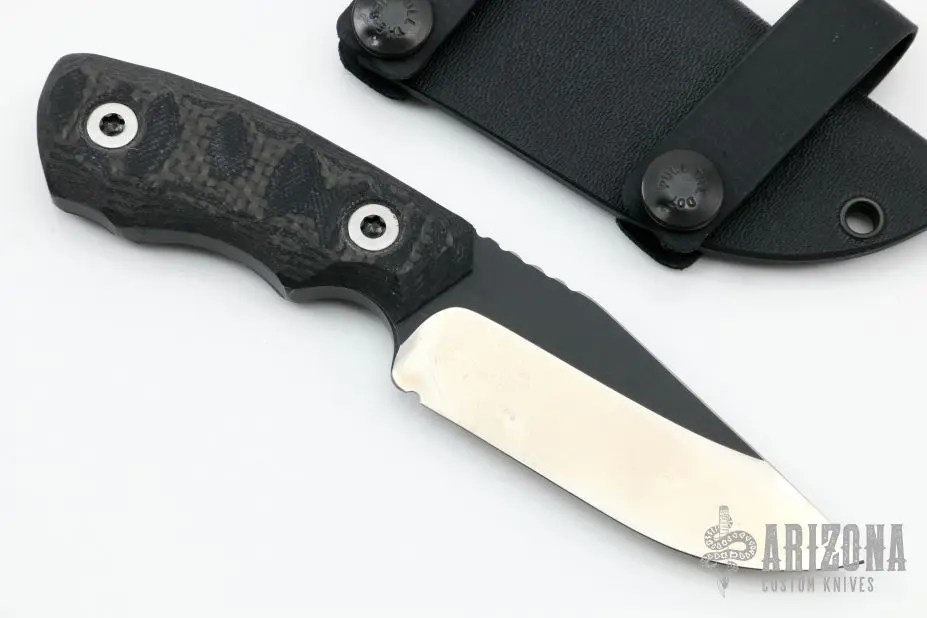 This fixed blade by Bill Coye features a two-tone blade with notched thumbrest, blade thickness of .222″ and blade depth of 1.290″, full tang construction. Great feel in the hand. Handle has sculpted black G-10 and carbon fiber scales. Comes with kydex sheath. Comes with original papers and COA. Excellent condition.