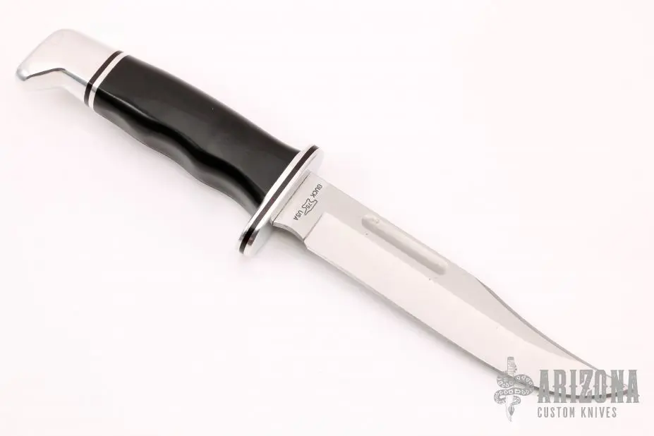 This Model 120 by Buck Knives features a satin finished clip point blade with false top edge and fullers, .175″ blade stock and 1.066″ blade depth, hidden tang construction. The handle has an aluminum guard and butt, and a black grip. Comes with original wooden display box. Excellent condition.Â