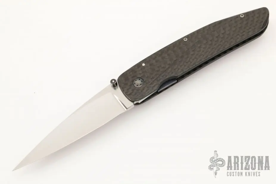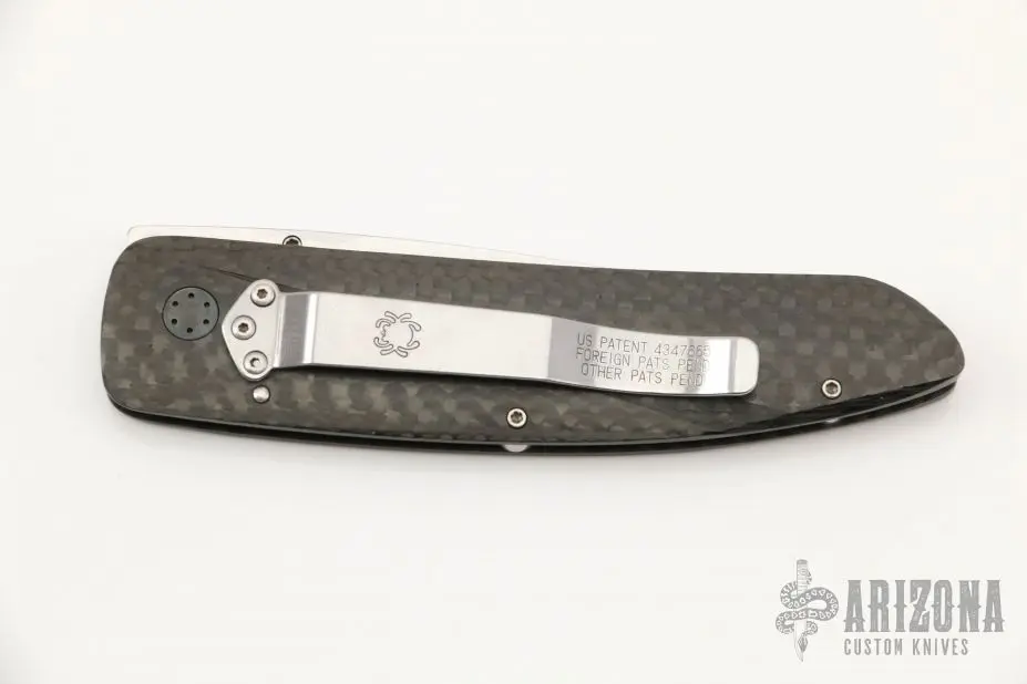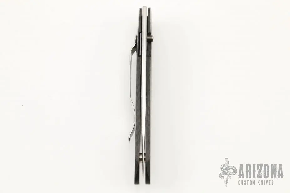This linerlock by Owen Wood features a hand rub satin finished blade with a single checkered thumbstud. The handle has carbon fiber scales with a single anodized titanium liner, tip down stainless steel clip. Nice detent, lockup and blade seating. Excellent condition.