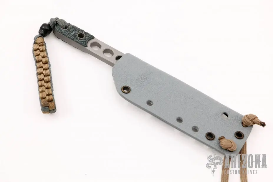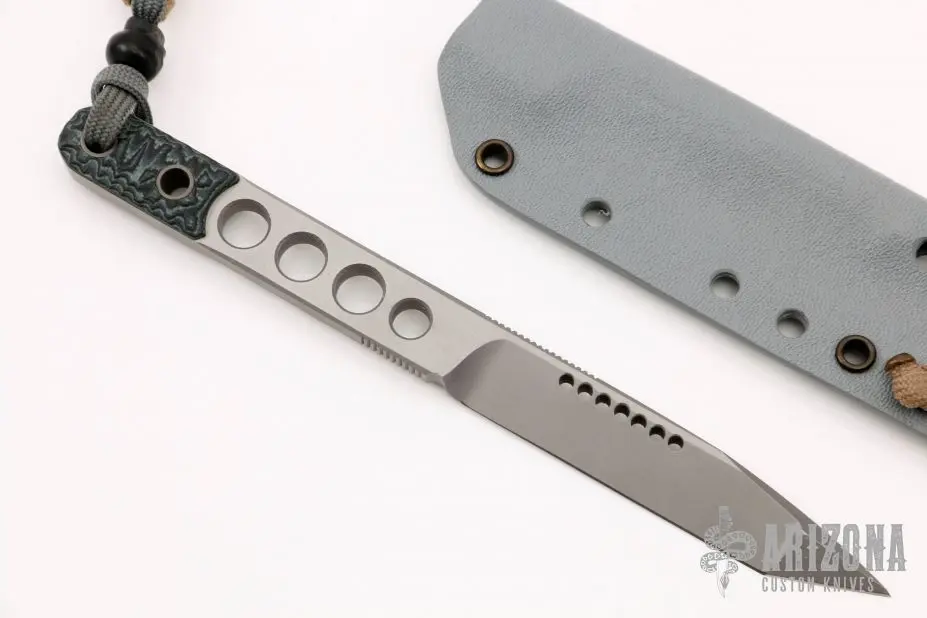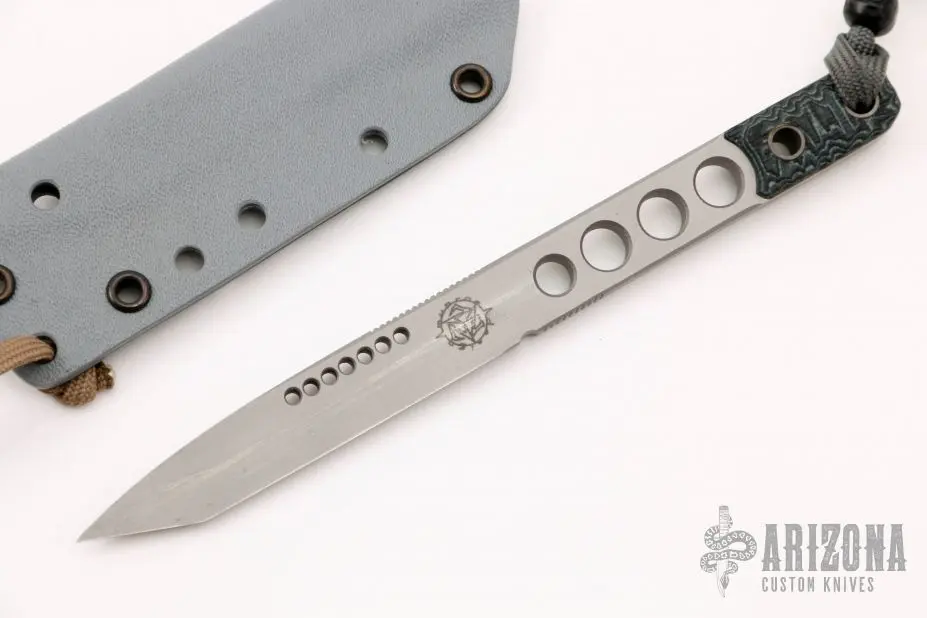 This Guard Rail by DC Munroe features a bead blasted chisel ground tanto blade with notched thumb and finger rests, .213″ blade stock and .566″ blade depth, full tang construction. Comes with a kydex sheath. Excellent condition.