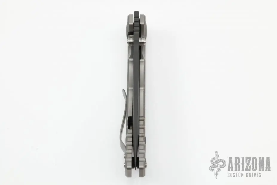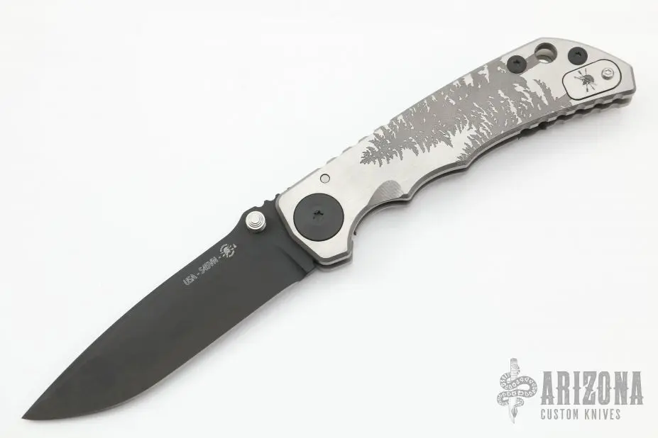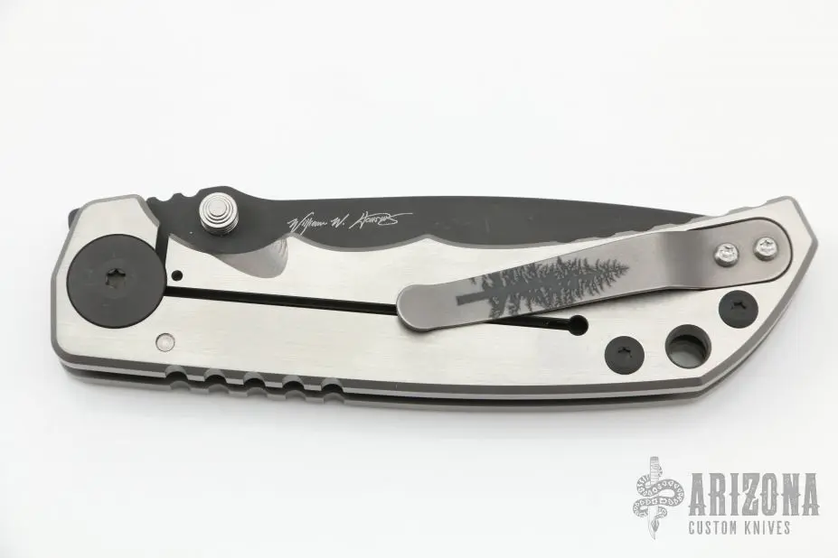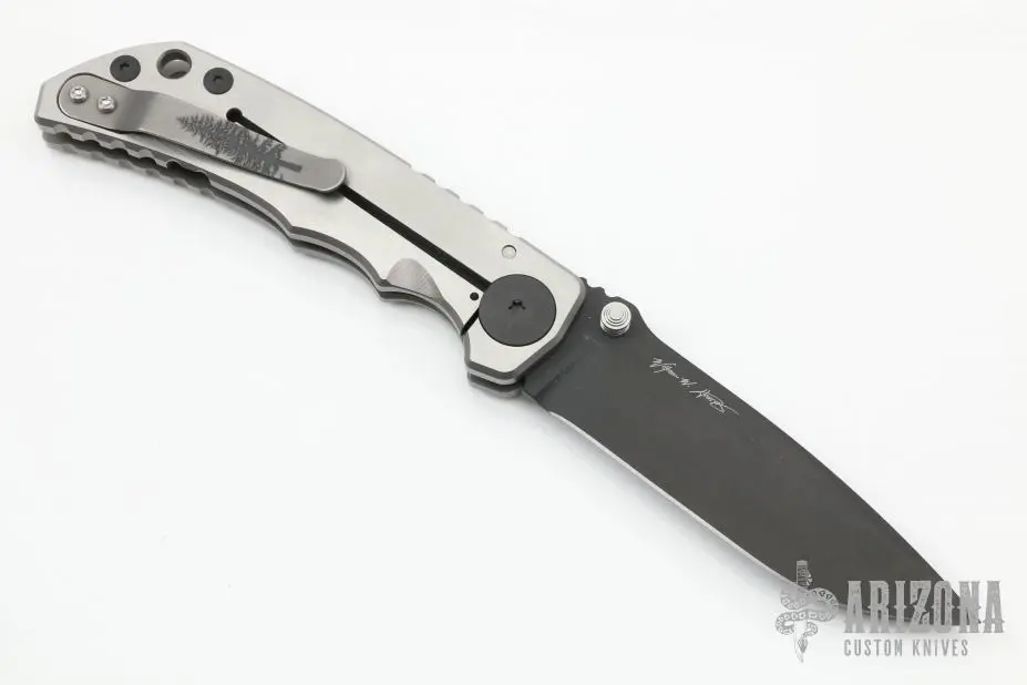 This Harsey framelock folder by Spartan Blades features a black drop point blade with dual thumbstuds and a notched thumbrest. The handle has a titanium frame with a laser engraving, a tip up titanium clip and filler tab. Has nice detent, lockup, and blade seating. Â Blade steel: S45VN. Light scratches are visible on the frame otherwise the knife is in good condition. Â