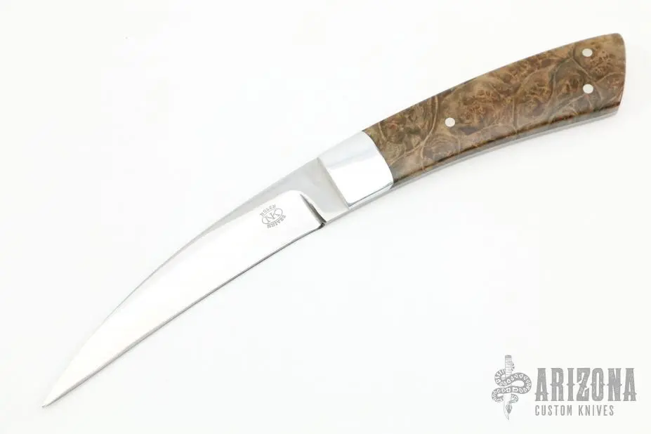 This knife by R.D. Nolen features a mirror polished chisel ground hawkbill style blade with a full tang construction. Â .136″ Blade Stock. Â .816″ Â Blade Depth. The handle features a polished steel bolster and a single burl scale. Â Light scratches are visible on the blade and handle otherwise the knife is in good condition. Â