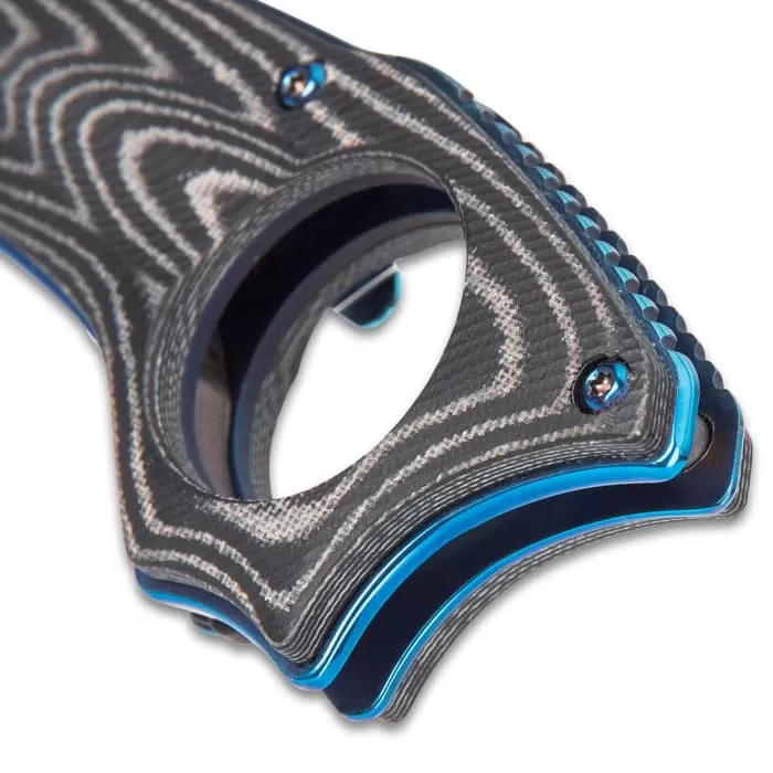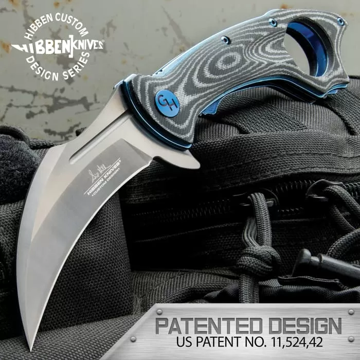 The Hibben Warbird Folding Karambit is so eye-catching yet so completely functional, as you’ve come to expect with a Gil Hibben original. You’ll always have a tool in your hand that can be used every day. The folding karambit has a 3 1/8” 7Cr17 stainless steel, curved blade with a dark grey titanium coating. The razor-sharp blade can be easily deployed using the flipper to access the smooth, ball bearing opening system. The patent pending blade covering mechanism allows the karambit to have a blade the full length of the handle without risk of cutting a finger when closing it. The open-ring handle scales are of dark grey linen Micarta, secured with blue screws to match the metallic blue liners. The karambit is 4 3/4”, when closed, 7 1/2” in overall length, and has a blue metallic pocket clip with the Hibben Knives logo.