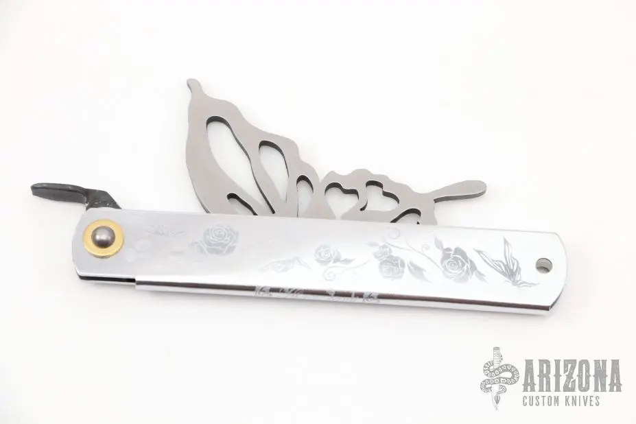 This Higonokami features a friction folder style blade and a stainless steel handle. Â Brass pivot collars. Comes with original box and papers. Blade Steel: HITACHI YASUKI AOGAMI/ Blue Steel. Excellent condition.Â