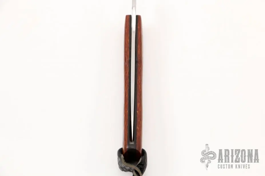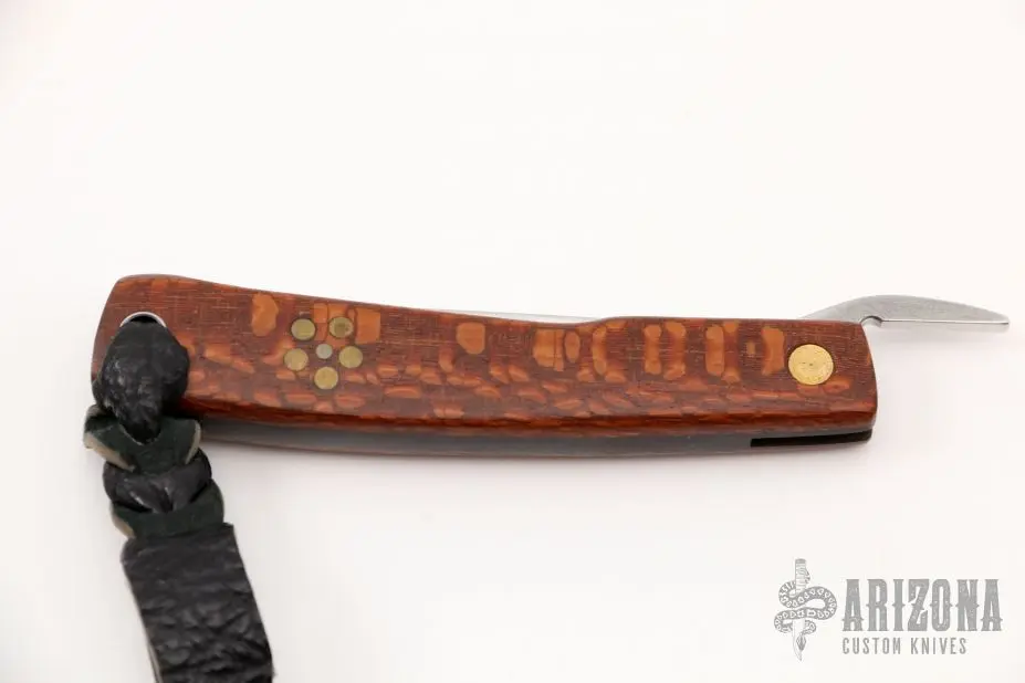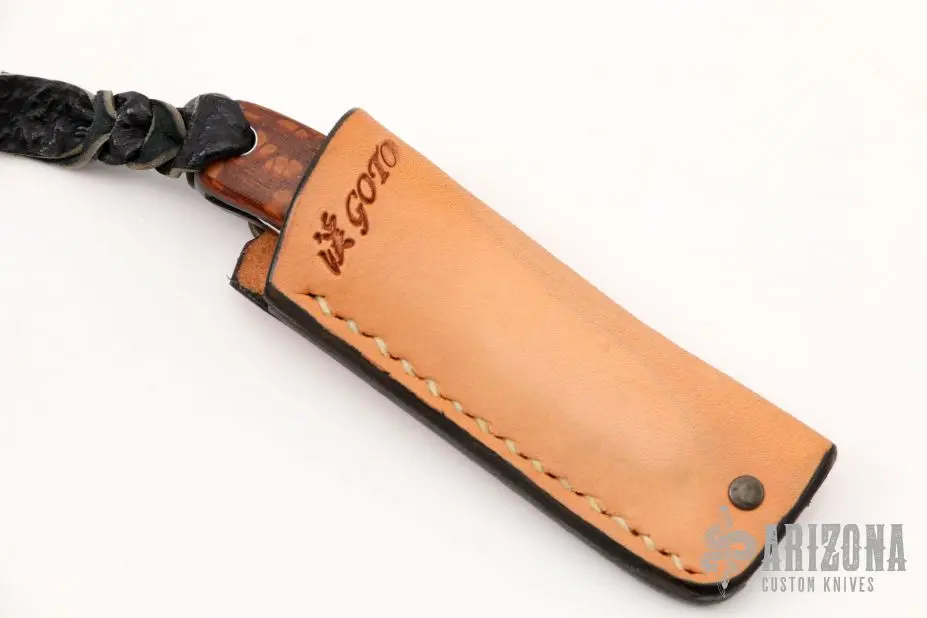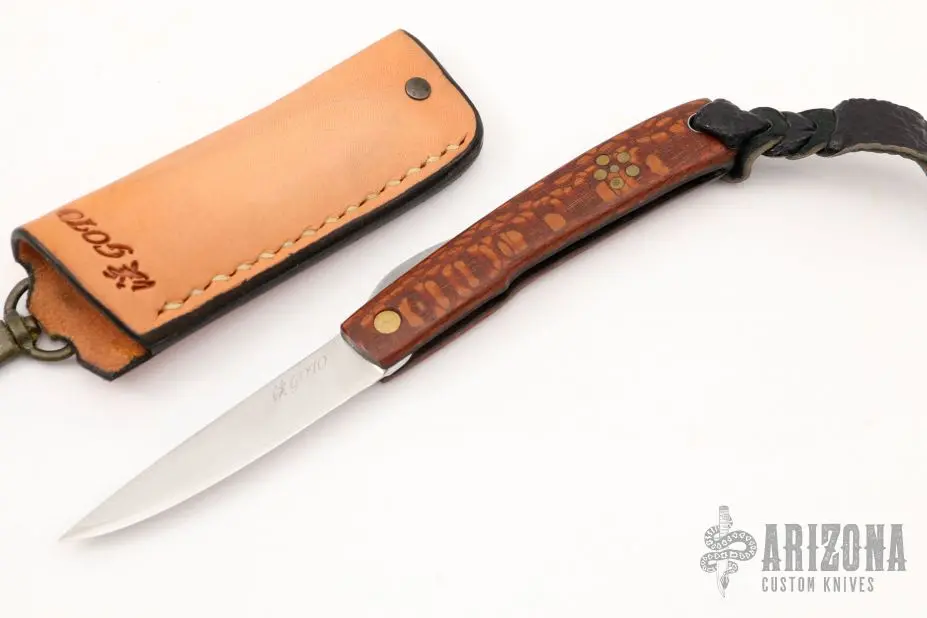 This Higonokami by Kei Goto features a VG-10 San Mai Damascus blade. The handle is one piece of Lacewood with brass and nickel silver pins, lanyard hole. Comes with a leather slip sheath. Excellent condition.