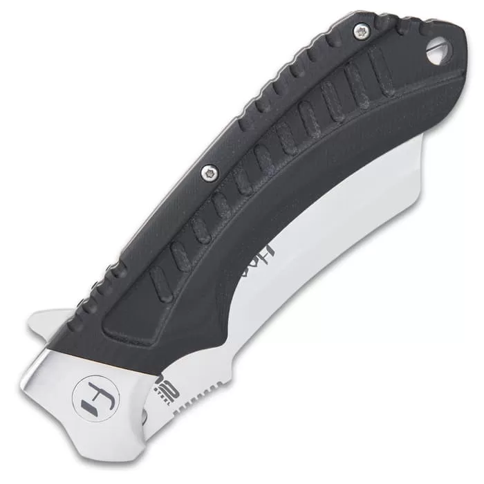 The Honshu Sekyuriti Razor Pocket Knife is savage blend of style and function. This is the EDC you’ve been looking for to get the job done wherever you take it! It has a 3 7/8” D2 tool steel blade with thumb notches and it can be opened smoothly with a ball bearing mechanism. The handle scales are black G10 with deep ridges to give you a secure, slip-free grip and the handle has a lanyard hole. The cutting edge pocket knife is 4 7/8” when closed, and has a spring hardened, bead-blasted stainless steel pocket clip.