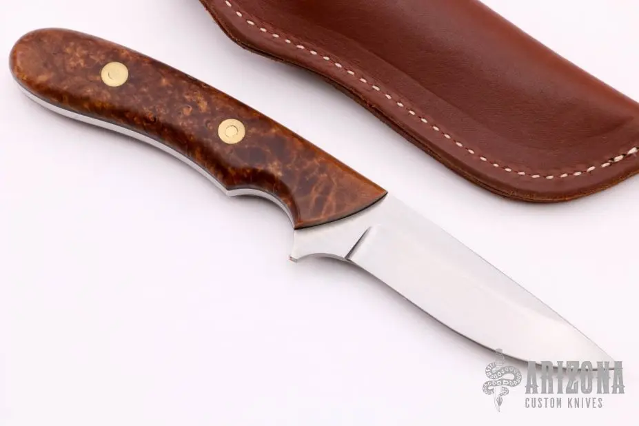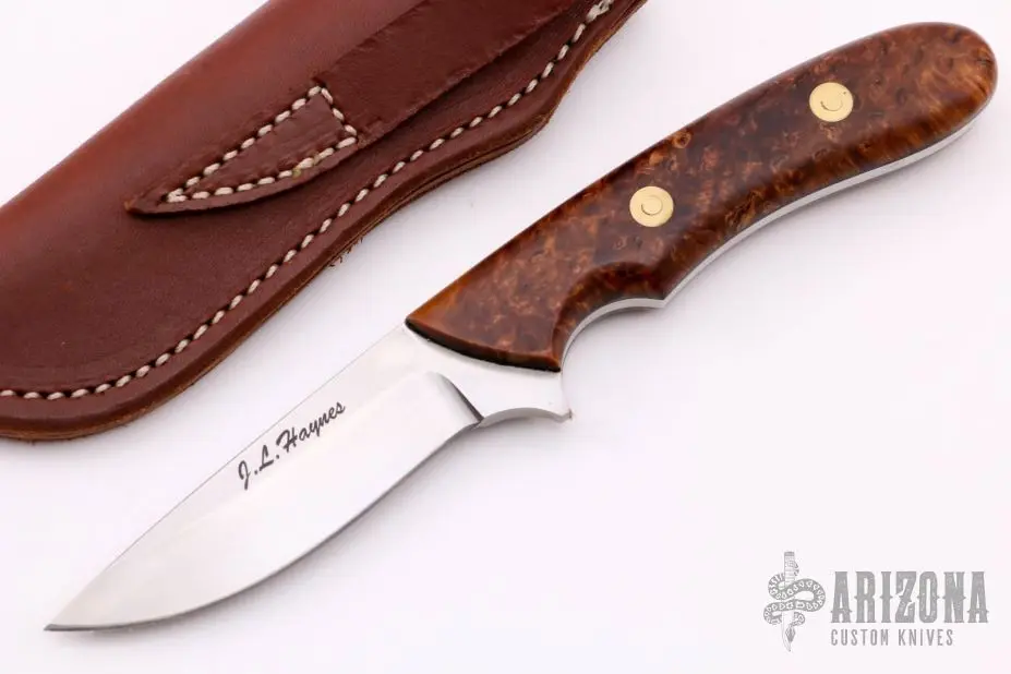 This Hunter by JL Haynes features a hand rubbed satin finished blade, .175″ blade stock and .924″ blade depth, full tang construction. The handle has burl wood scales with black liners and brass pins. Comes with a brown leather sheath. Excellent condition.