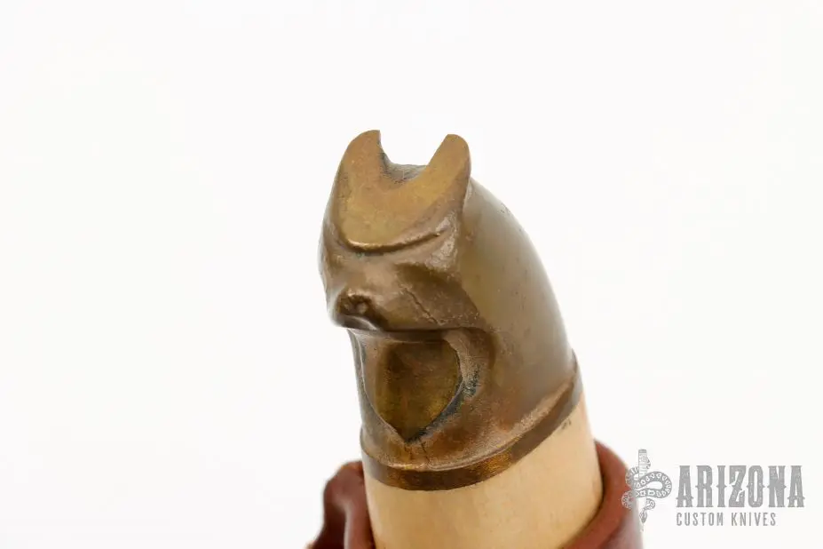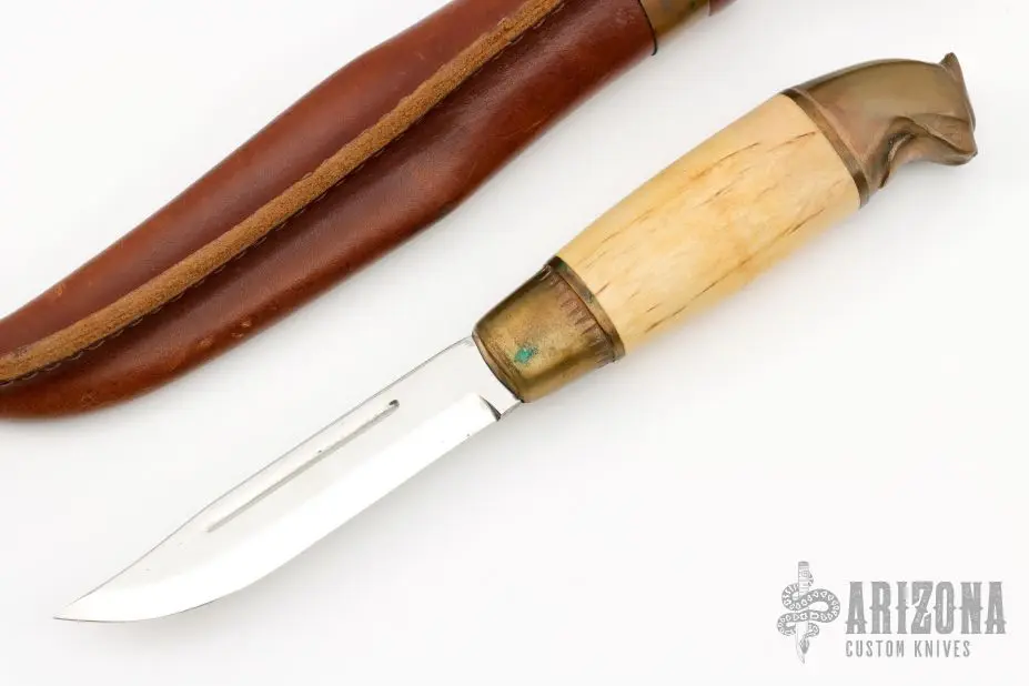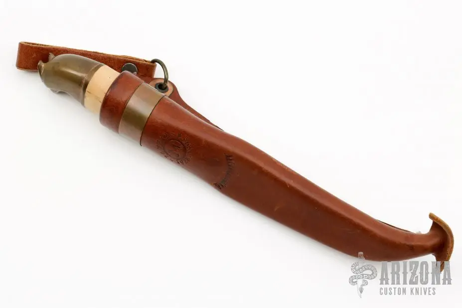 This knife from the well known European maker J Marttiini features a mirror polished scandi ground blade with fullers, .116″ blade stock and .778″ blade depth, hidden tang construction. The handle has a wood grip with brass guard and butt. Very utilitarian. Comes with a brown leather sheath. Excellent condition. Signed and and marked 3341/98.