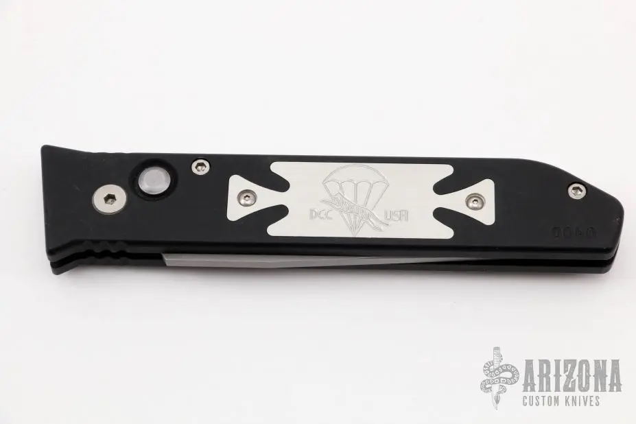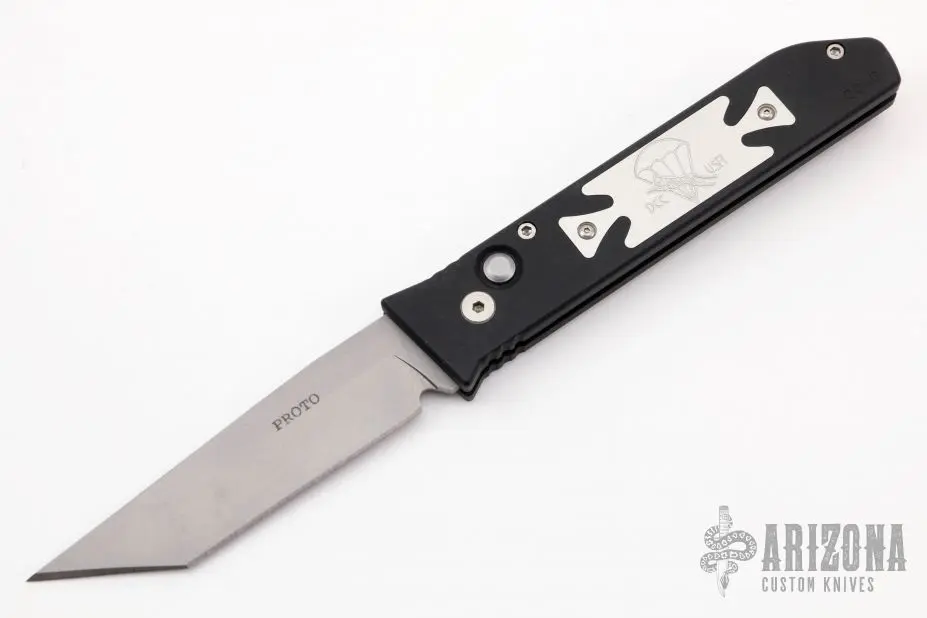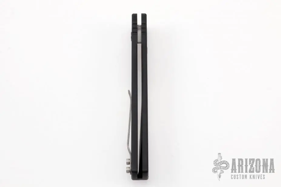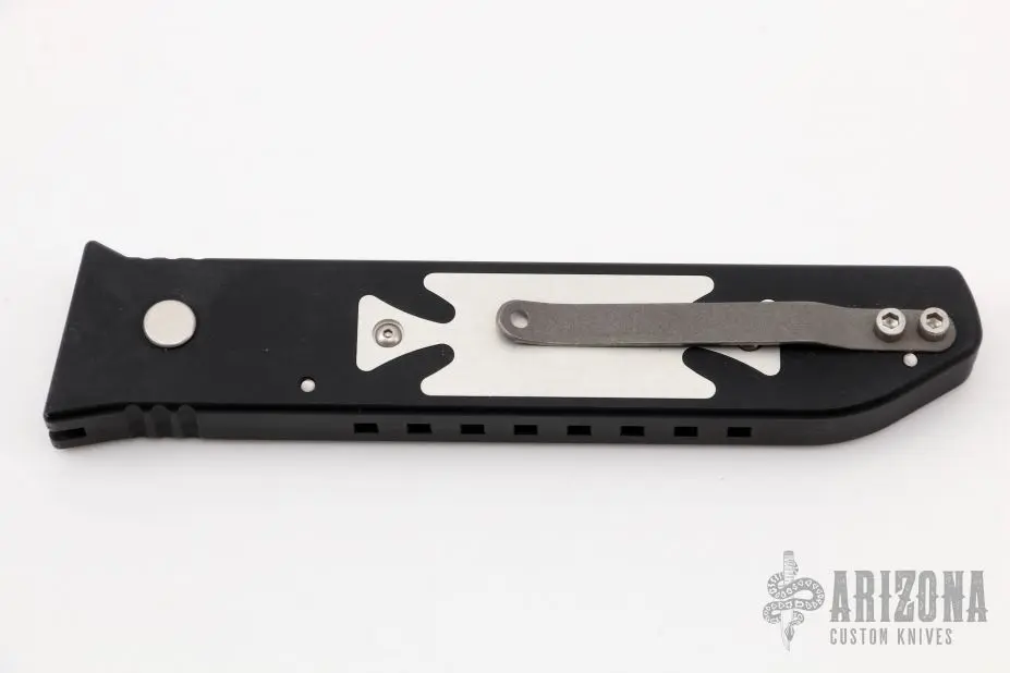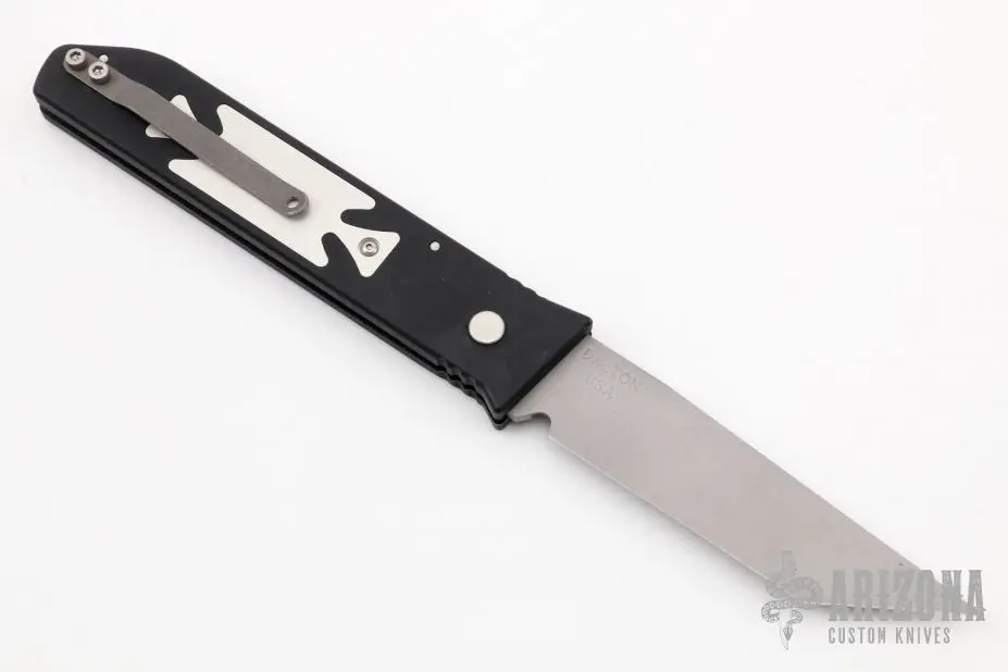 This Jammer Prototype by Rob Dalton features a bead blast chisel ground tanto blade and a black aluminum handle with an aluminum inlay. Bead blast titanium clip, tip up carry. Strong and fast coil-spring opening. Has a few light scuffs, otherwise excellent condition. Numbered 040 on frame.